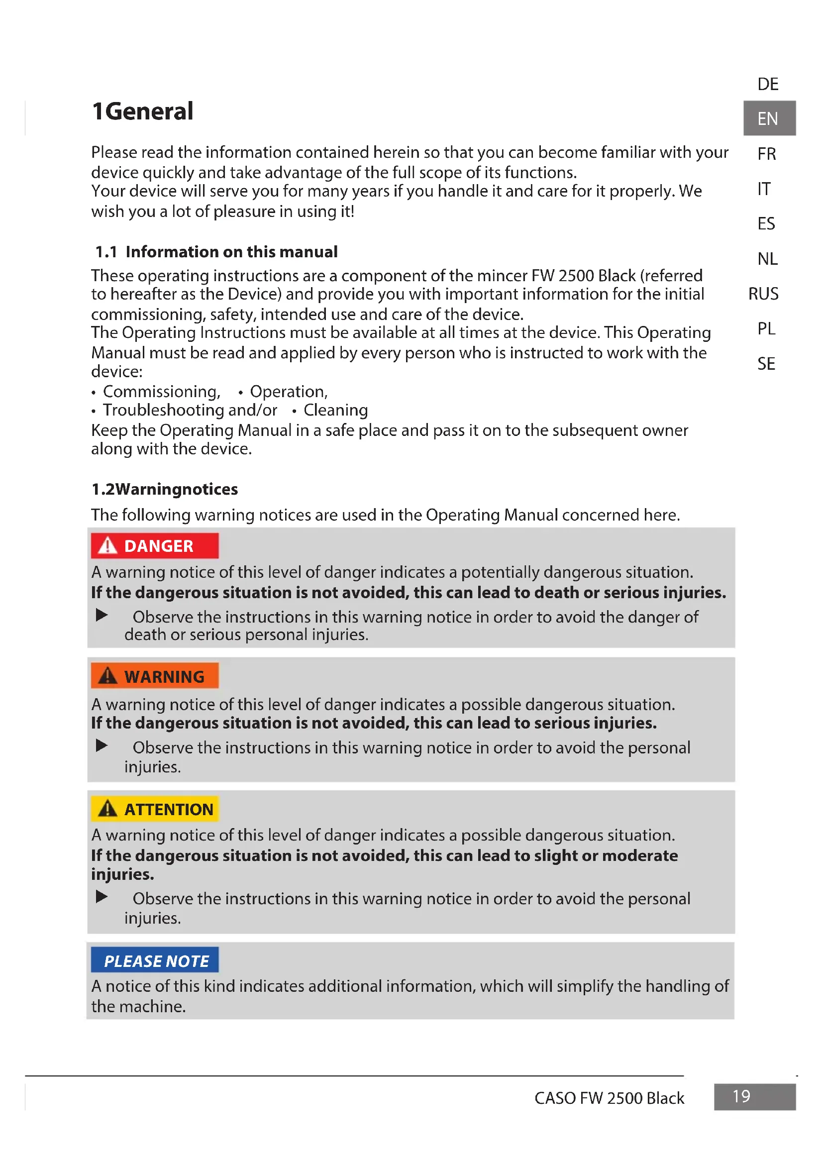These operating instructions are a component of the mincer FW 2500 Black (referred to hereafter as the Device) and provide you with important information for the initial commissioning, safety, intended use and care of the device. The Operating Instructions must be available at all times at the device. This Operating Manual must be read and applied by every person who is instructed to work with the device: