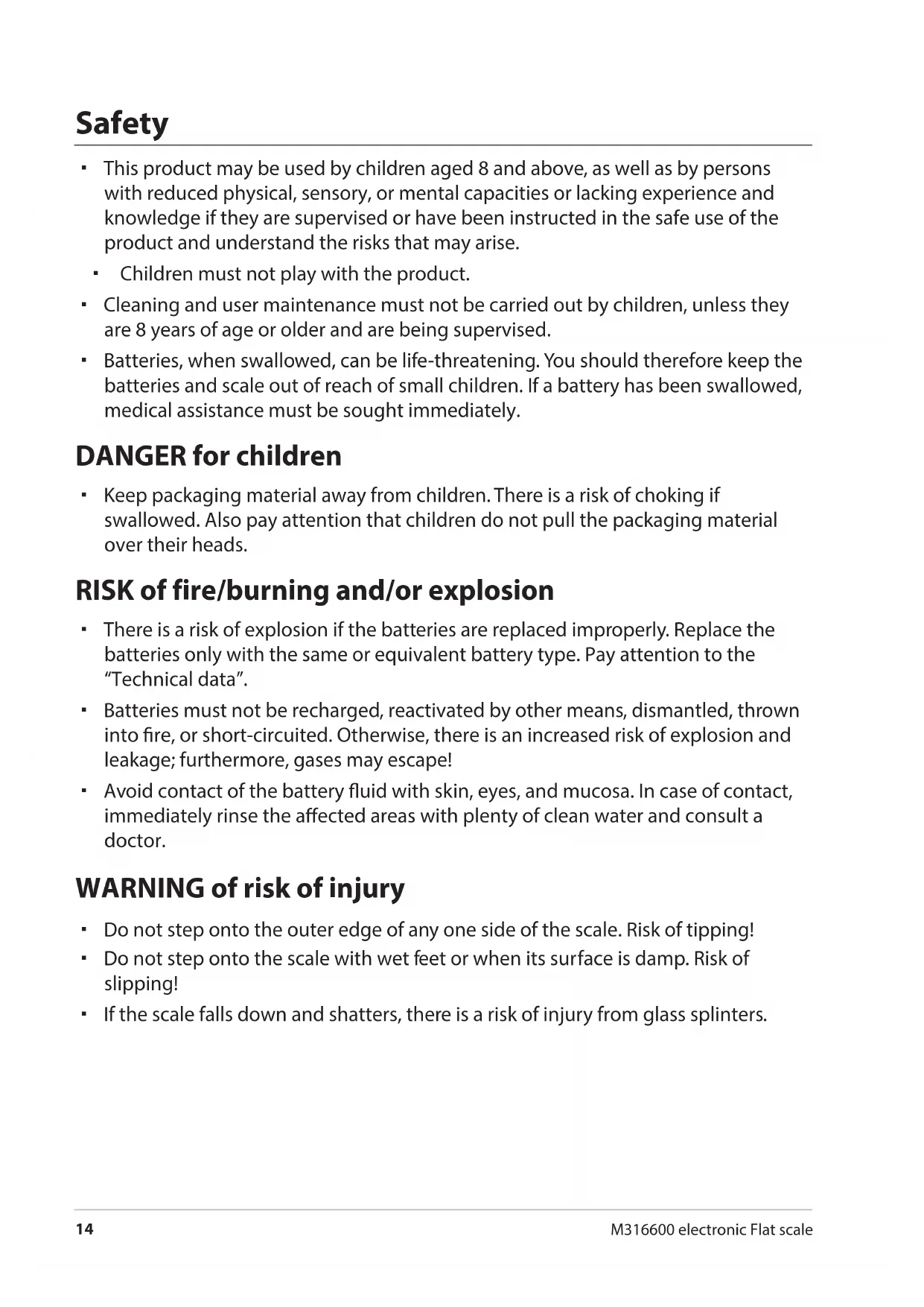 M316600 electronic Flat scale Safety This product may be used by children aged 8 and above, as well as by persons with reduced physical, sensory, or mental capacities or lacking experience and knowledge if they are supervised or have been instructed in the safe use of the product and understand the risks that may arise. Children must not play with the product. Cleaning and user maintenance must not be carried out by children, unless they are 8years of age or older and are being supervised. Batteries, when swallowed, can be life-threatening. You should therefore keep the batteries and scale out of reach of small children. If a battery has been swallowed, medical assistance must be sought immediately. DANGER for children Keep packaging material away from children. There is a risk of choking if swallowed. Also pay attention that children do not pull the packaging material over their heads. RISK of fire/burning and/or explosion There is a risk of explosion if the batteries are replaced improperly. Replace the batteries only with the same or equivalent battery type. Pay attention to the “Technical data”. Batteries must not be recharged, reactivated by other means, dismantled, thrown into re, or short-circuited. Otherwise, there is an increased risk of explosion and leakage; furthermore, gases may escape! Avoid contact of the battery uid with skin, eyes, and mucosa. In case of contact, immediately rinse the aected areas with plenty of clean water and consult a doctor. WARNING of risk of injury Do not step onto the outer edge of any one side of the scale. Risk of tipping! Do not step onto the scale with wet feet or when its surface is damp. Risk of slipping! If the scale falls down and shatters, there is a risk of injury from glass splinters.Intended use