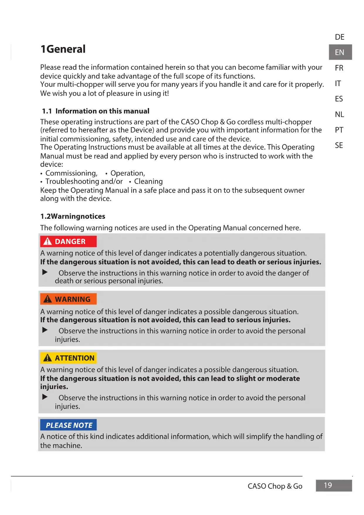 These operating instructions are part of the CASO Chop & Go cordless multi-chopper (referred to hereafter as the Device) and provide you with important information for the initial commissioning, safety, intended use and care of the device. The Operating Instructions must be available at all times at the device. This Operating Manual must be read and applied by every person who is instructed to work with the device: