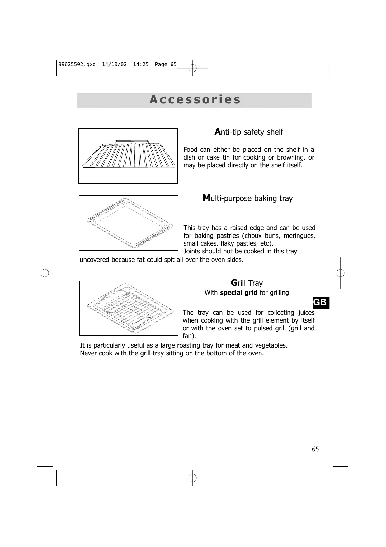 GB The tray can be used for collecting juices when cooking with the grill element by itself or with the oven set to pulsed grill (grill and fan). It is particularly useful as a large roasting tray for meat and vegetables. Never cook with the grill tray sitting on the bottom of the oven.