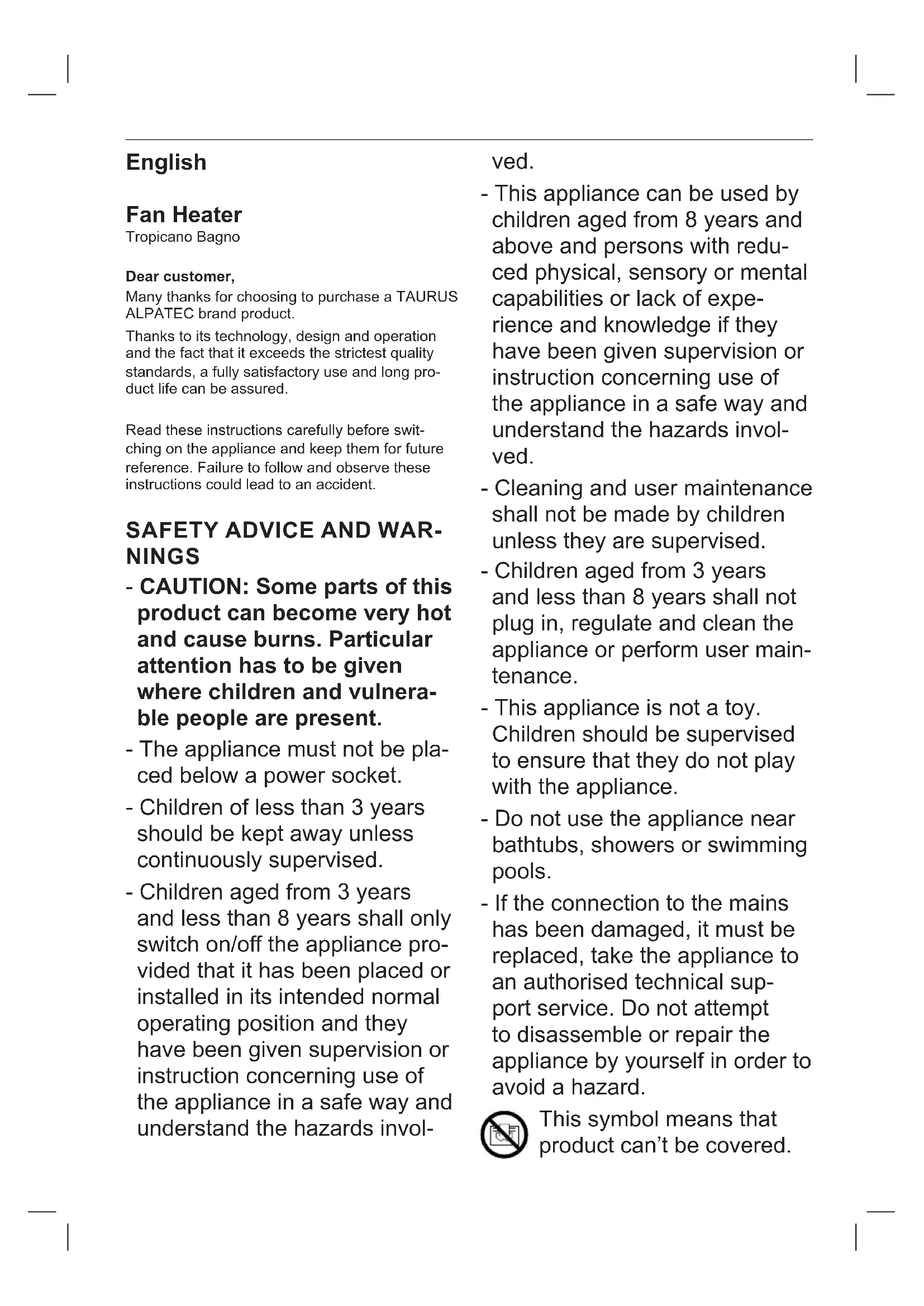 Información de contacto "ELECTRODOMÉSTI- COS TAURUS, S.L. Avda. Barcelona S/N 25790 Oliana, Lleida, Spain”English Fan Heater Tropicano Bagno Dear customer, Many thanks for choosing to purchase a TAURUS ALPATEC brand product. Thanks to its technology, design and operation and the fact that it exceeds the strictest quality standards, a fully satisfactory use and long pro- duct life can be assured. Read these instructions carefully before swit- ching on the appliance and keep them for future reference. Failure to follow and observe these instructions could lead to an accident.