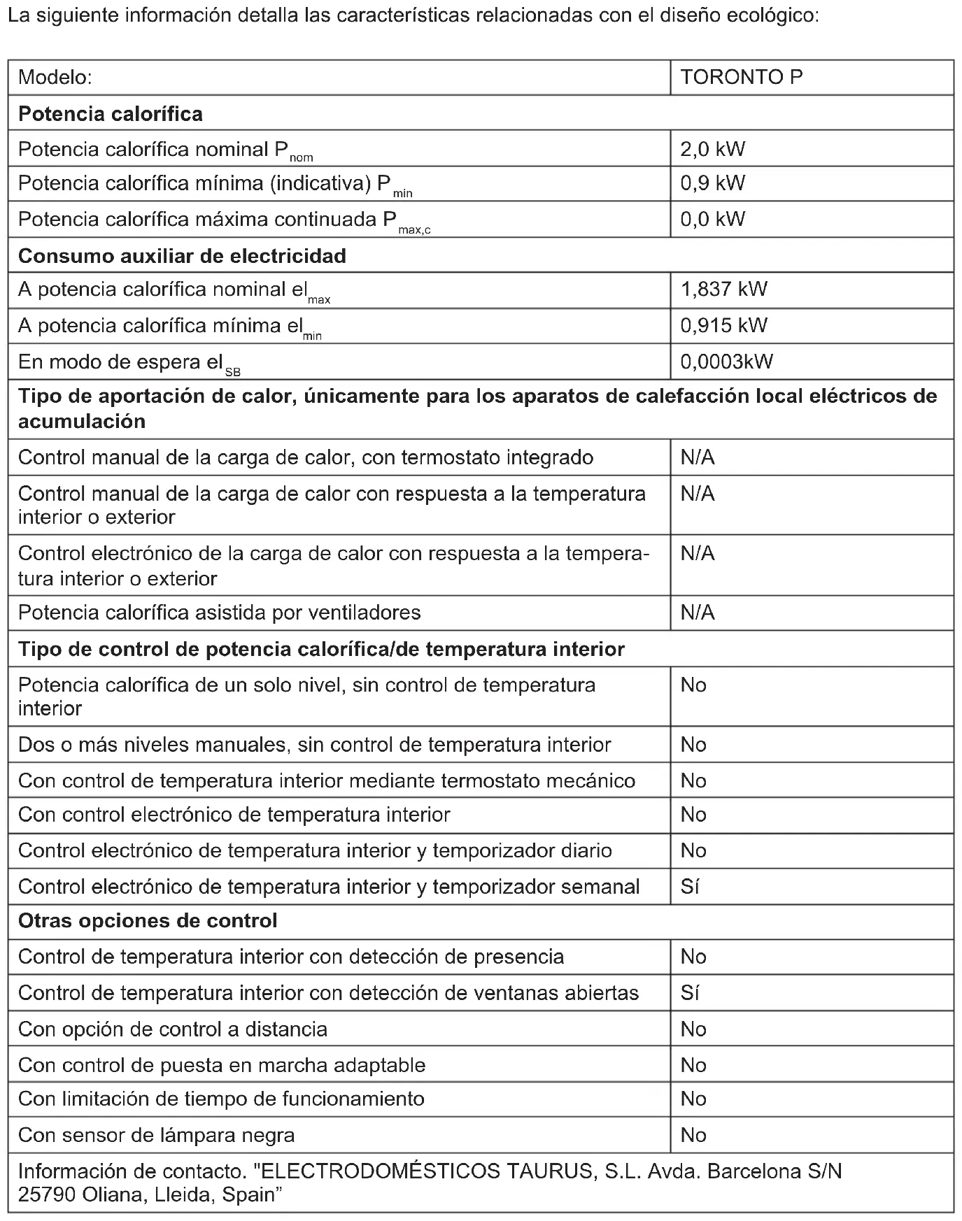 PRODUCT - The materials of which the packaging of this appliance consists are included in a collec- tion, classication and recycling system. Should you wish to dispose of them, use the appropriate public recycling bins for each type of material. - The product does not contain concentrations of substances that could be considered harm- ful to the environment. This symbol means that in case you wish to dispose of the product once its working life has ended; take it to an authorised waste agent for the selective collection of Waste from Electric and Electronic Equipment (WEEE). This appliance complies with Directive 2014/35/EU on Low Voltage, Directive 2014/30/ EU on Electromagnetic Compatibility, Directive 2011/65/EU on the restrictions of the use of certain hazardous substances in electrical and electronic equipment and Directive 2009/125/ EC on the eco-design requirements for energy- related products.The following information details the features related to ecodesign. Model: TORONTO P Heat output Nominal heat output P nom 2,0 kW Minimum heat output (indicative) P min 0,9 kW Maximum continuous heat output P max,c 0,0 kW Auxiliary electricity consumption At nominal heat output el max 1,837 kW At minimum heat output el min 0,915 kW In standby mode el
