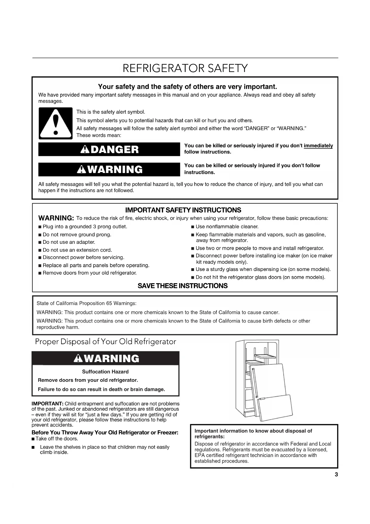 ACCESSOIRES.......................................................................................... 48 FEUILLES DE DONNÉES SUR LA PERFORMANCE ............................. 49 GARANTIE.................................................................................................. 513 REFRIGERATOR SAFETY Proper Disposal of Your Old Refrigerator IMPORTANT: Child entrapment and suffocation are not problems of the past. Junked or abandoned refrigerators are still dangerous – even if they will sit for “just a few days.” If you are getting rid of your old refrigerator, please follow these instructions to help prevent accidents.Before You Throw Away Your Old Refrigerator or Freezer:■ Take off the doors. ■ Leave the shelves in place so that children may not easily climb inside. You can be killed or seriously injured if you don't immediately You can be killed or seriously injured if you don'tfollow All safety messages will tell you what the potential hazard is, tell you how to reduce the chance of injury, and tell you what can happen if the instructions are not followed. Your safety and the safety of others are very important. We have provided many important safety messages in this manual and on your appliance. Always read and obey all safety messages.This is the safety alert symbol.This symbol alerts you to potential hazards that can kill or hurt you and others.All safety messages will follow the safety alert symbol and either the word “DANGER” or “WARNING.”These words mean:follow instructions.instructions. DANGER WARNING