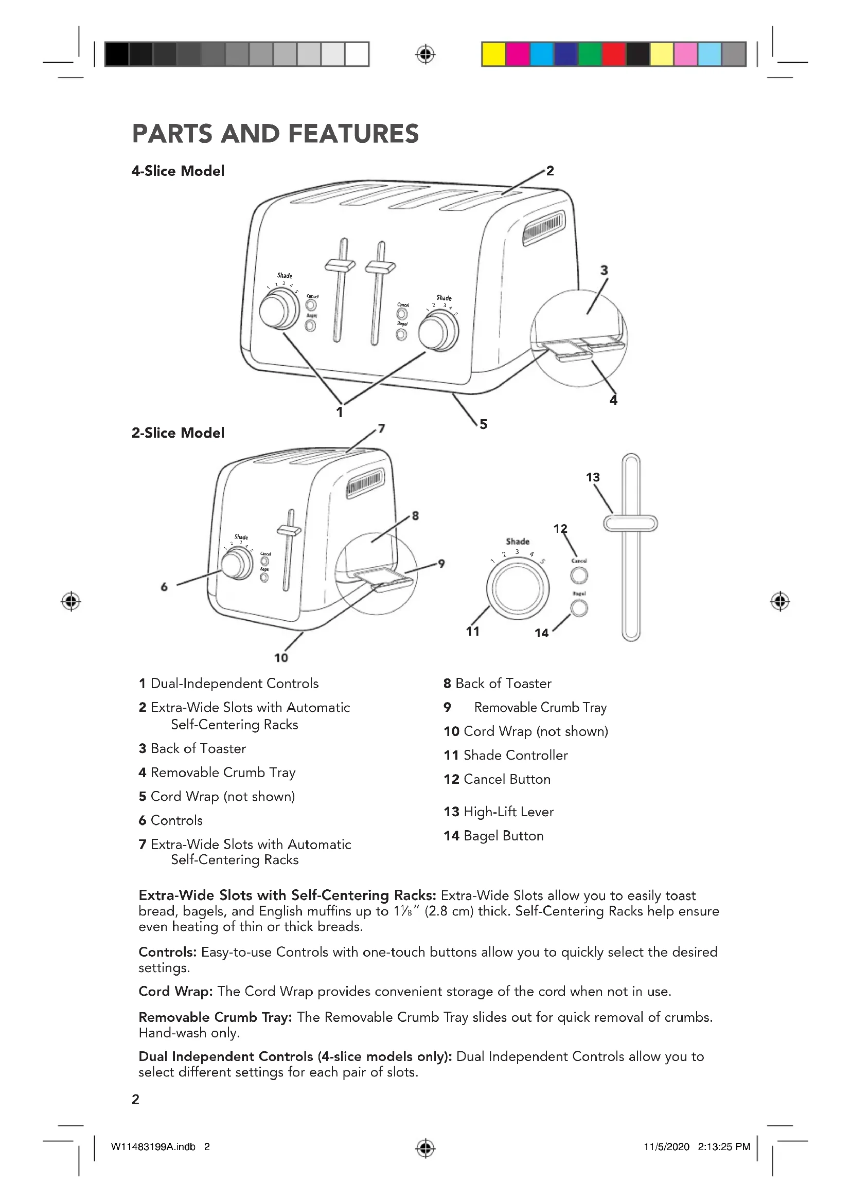 ” (2.8 cm) thick. Self-Centering Racks help ensure even heating of thin or thick breads. Controls: Easy-to-use Controls with one-touch buttons allow you to quickly select the desired settings. Cord Wrap: The Cord Wrap provides convenient storage of the cord when not in use. Removable Crumb Tray: The Removable Crumb Tray slides out for quick removal of crumbs. Hand-wash only. Dual Independent Controls (4-slice models only): Dual Independent Controls allow you to select different settings for each pair of slots. 4-Slice Model 2-Slice Model W11483199A.indb 2W11483199A.indb 2 11/5/2020 2:13:25 PM11/5/2020 2:13:25 PMENGLISH
