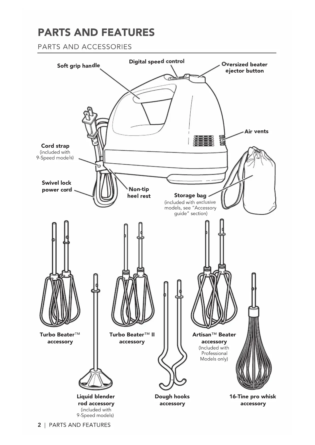 KHM72 KHM92 W10885900A_Final.indd 1 4/26/16 11:26 AM2 | PARTS AND FEATURES Swivel lock power cord Soft grip handle Oversized beater ejector button Digital speed control Air vents Non-tip heel rest Cord strap (included with 9-Speed models) Storage bag (included with exclusive models, see “Accessory guide” section)