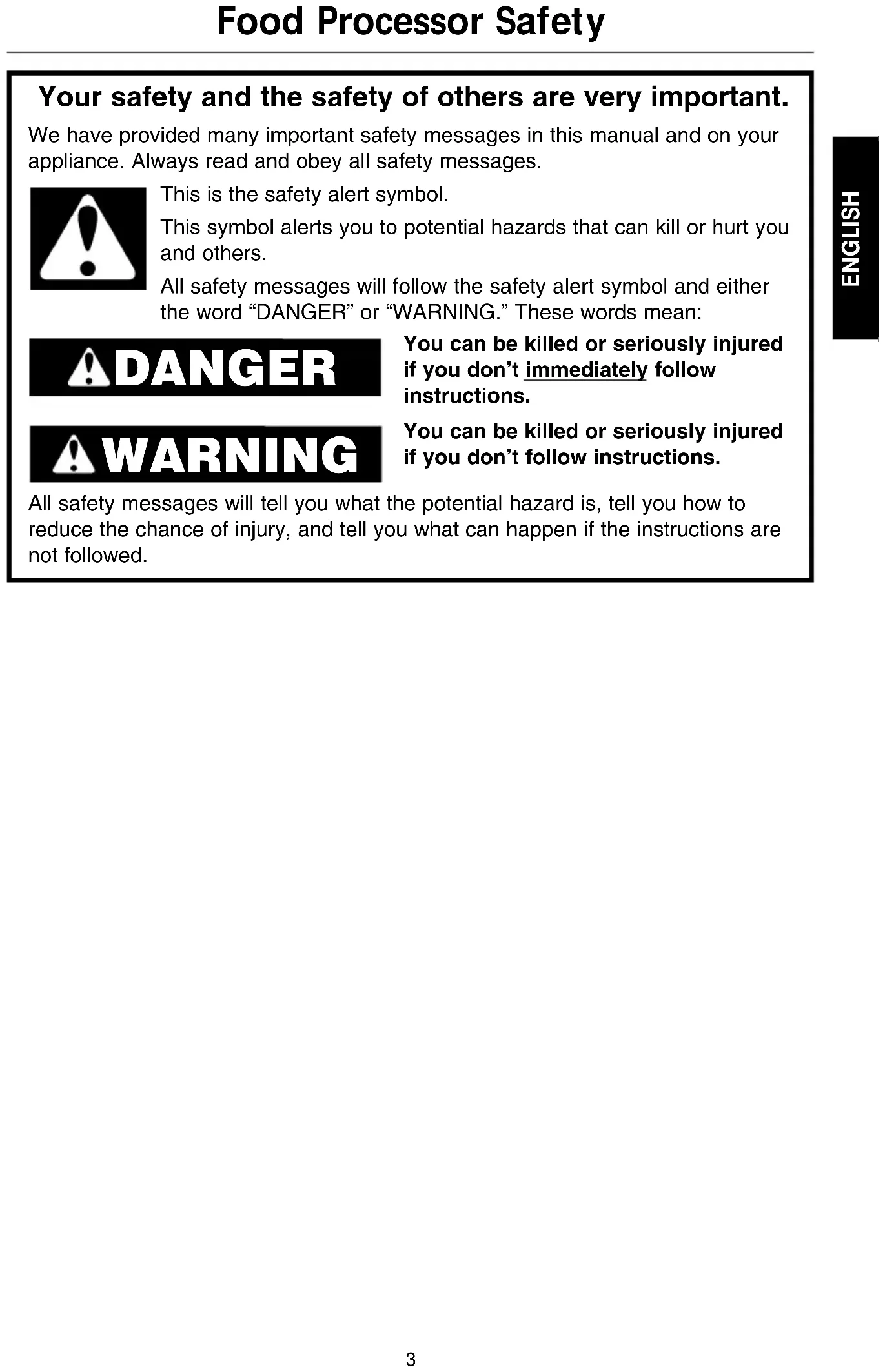 - How to Order Accessories and Replacement Parts ENGLISH3 Your safety and the safety of others are very important. We have provided many important safety messages in this manual and on your appliance. Always read and obey all safety messages. This is the safety alert symbol. This symbol alerts you to potential hazards that can kill or hurt you and others. All safety messages will follow the safety alert symbol and either the word “DANGER” or “WARNING.” These words mean: You can be killed or seriously injured if you don’t immediately follow instructions. You can be killed or seriously injured if you don’t follow instructions. All safety messages will tell you what the potential hazard is, tell you how to reduce the chance of injury, and tell you what can happen if the instructions are not followed. DANGER WARNING Food Processor Safety ENGLISHENGLISH IMPORTANT SAFEGUARDS When using electrical appliances, basic safety precautions should always be followed, including the following: p. 26