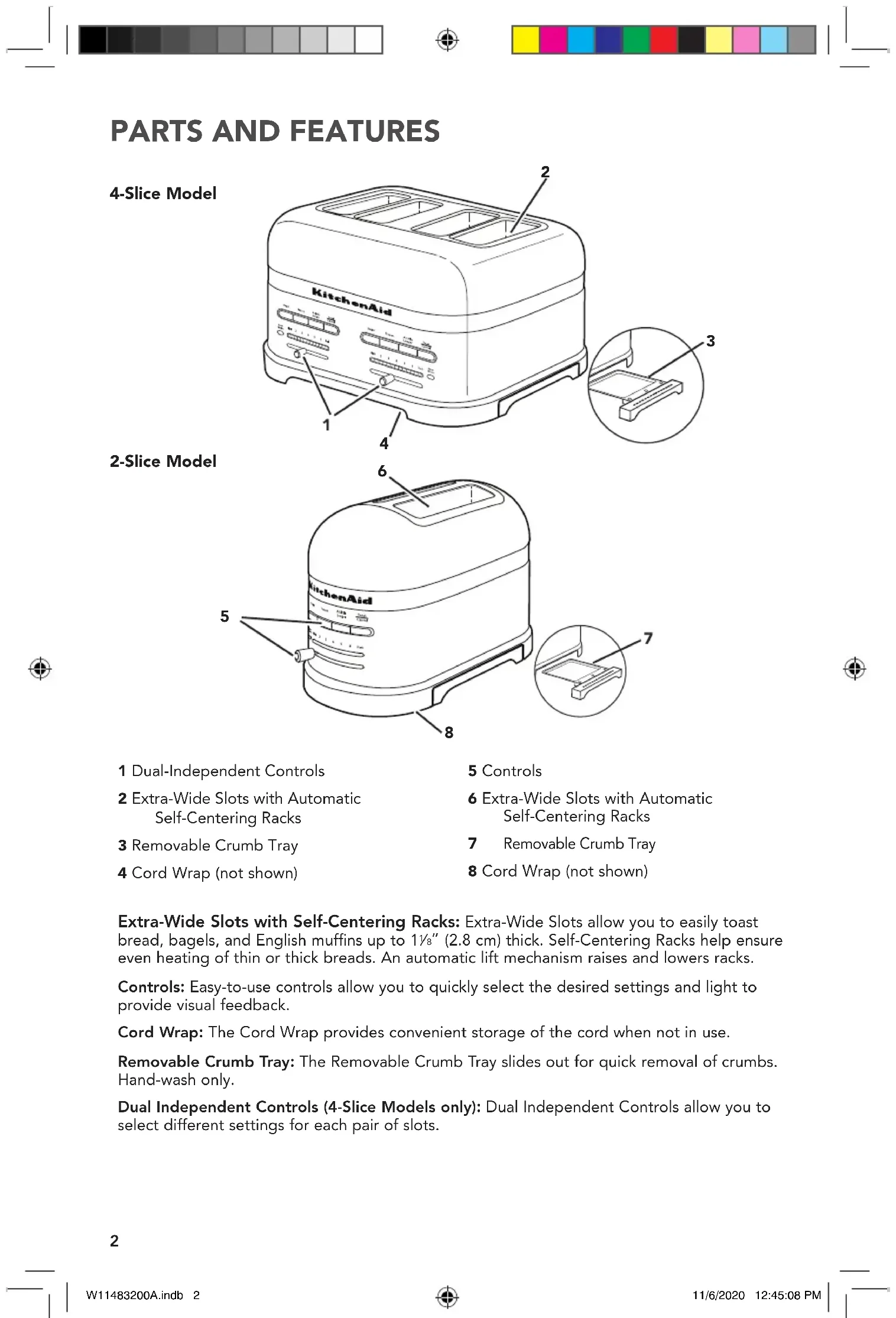 1 Dual-Independent Controls 2 Extra-Wide Slots with Automatic Self-Centering Racks 3 Removable Crumb Tray 4 Cord Wrap (not shown) 5 Controls 6 Extra-Wide Slots with Automatic Self-Centering Racks