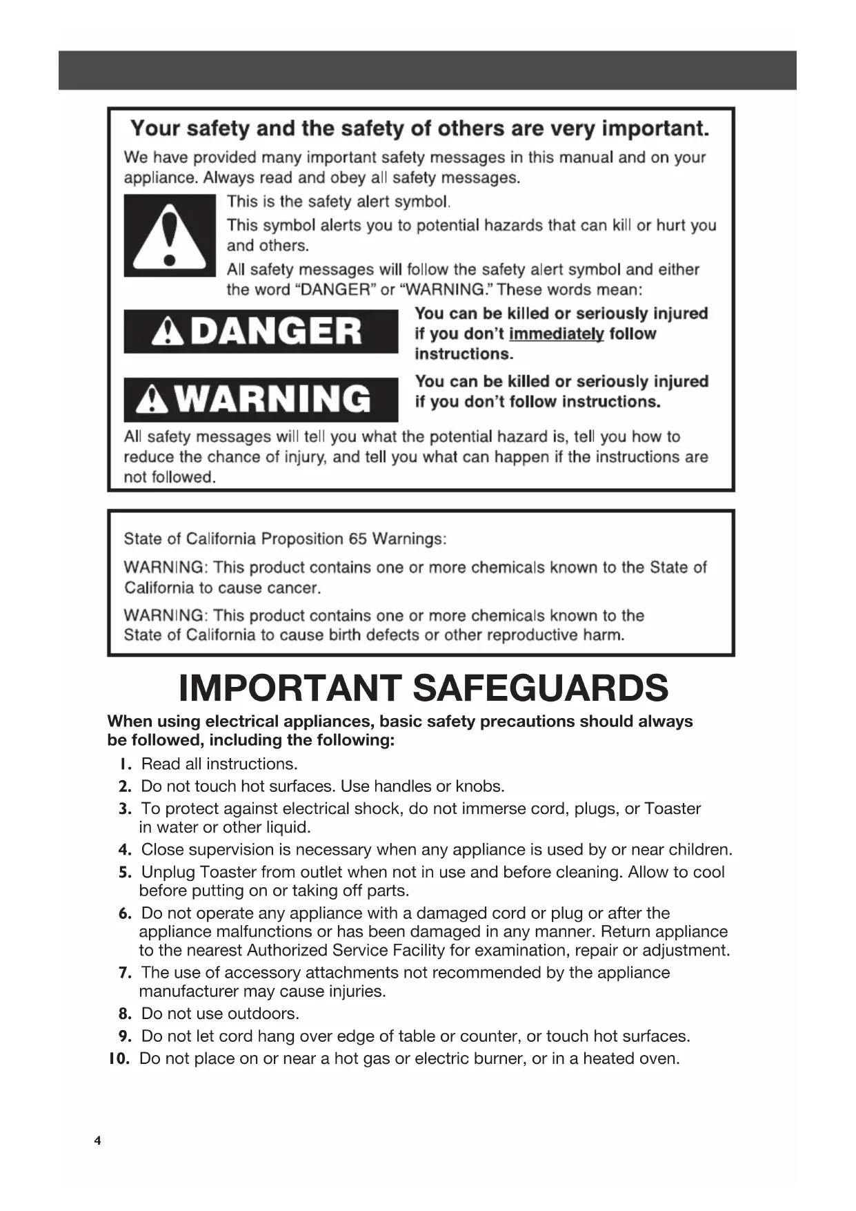 3. To protect against electrical shock, do not immerse cord, plugs, or Toaster