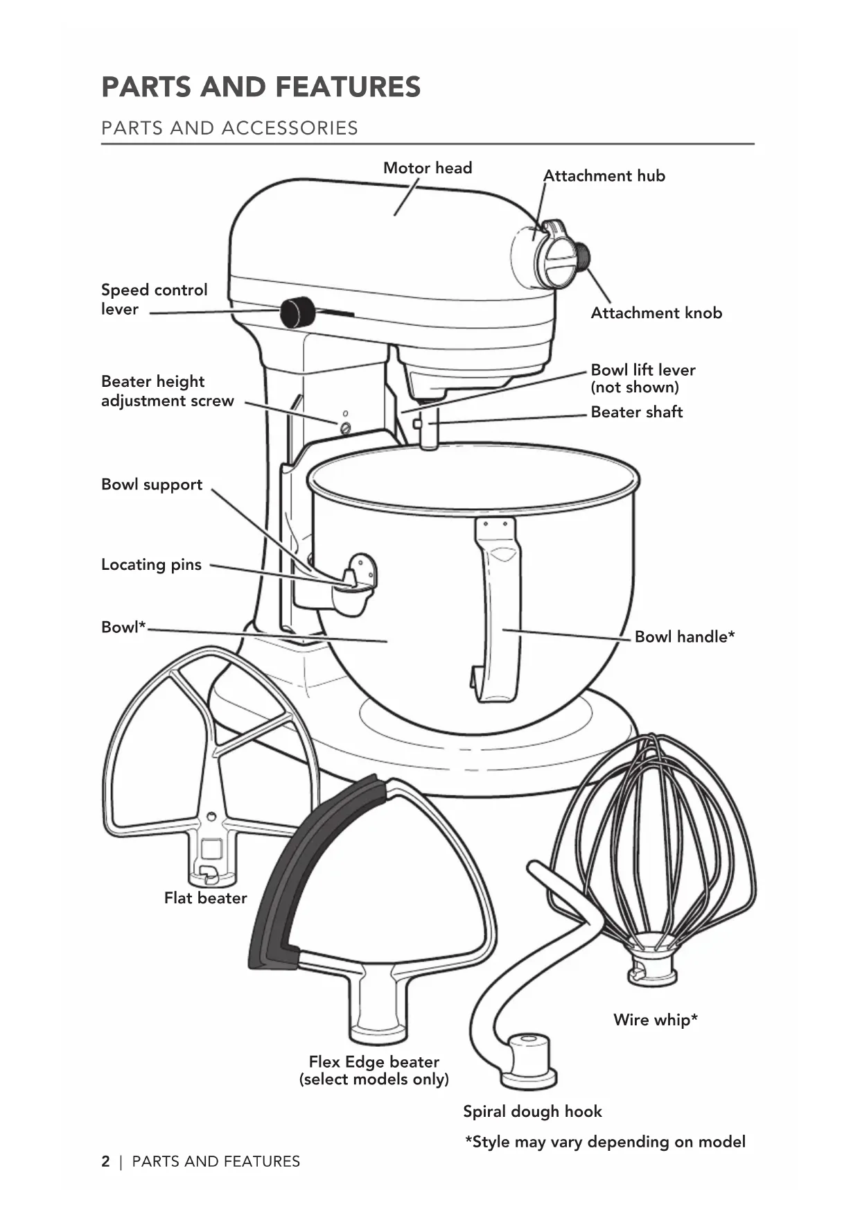 Motor head Attachment hub Attachment knob Speed control lever Beater height adjustment screw Bowl support Locating pins Flat beater Spiral dough hook Wire whip* Bowl* Bowl lift lever (not shown) Bowl handle* Beater shaft Flex Edge beater (select models only) *Style may vary depending on model W10862776A_EN_v09.indd 2 2/24/2016 3:36:07 PMENGLISH
