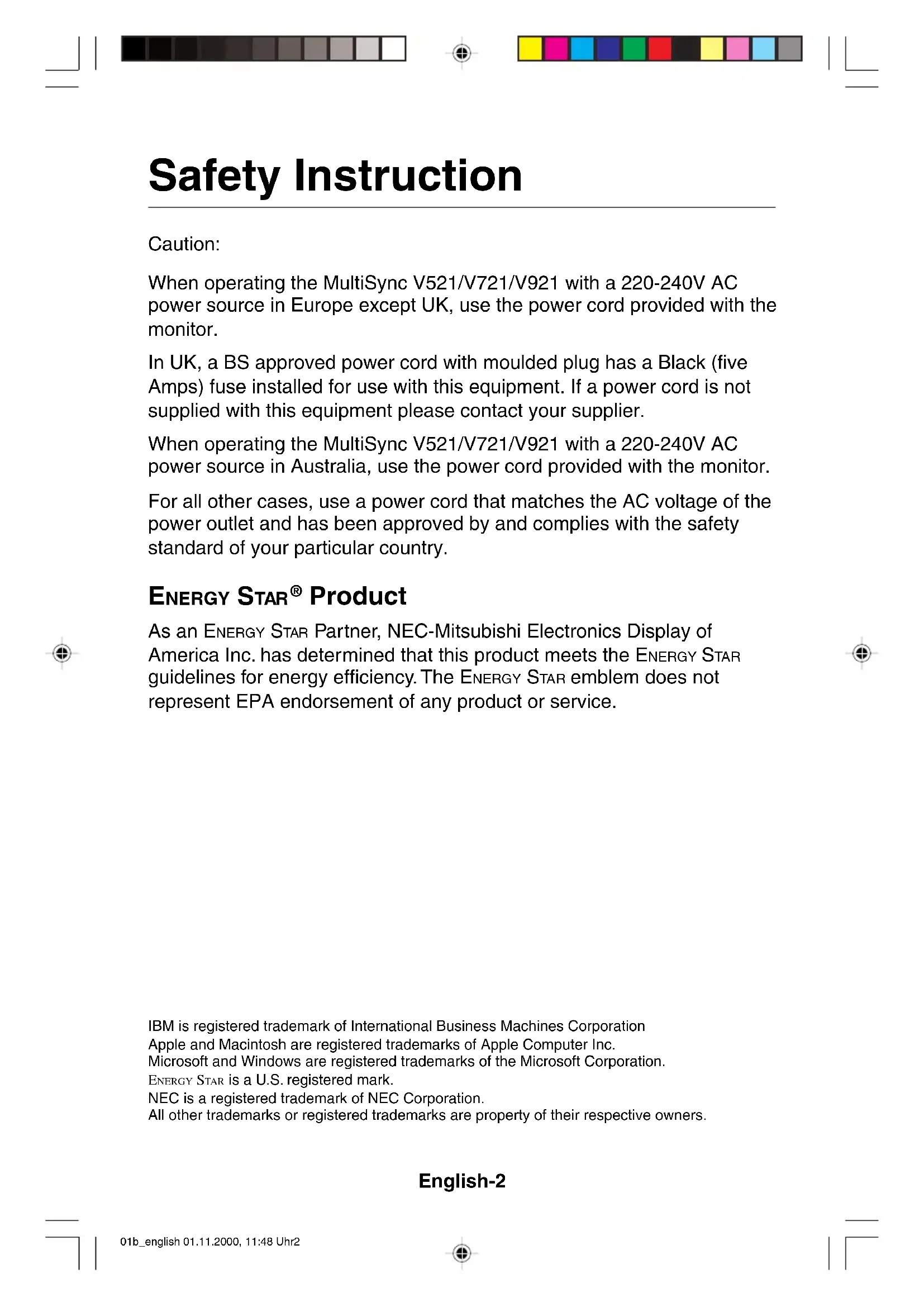 Product As an ENERGY STAR Partner, NEC-Mitsubishi Electronics Display of America Inc. has determined that this product meets the ENERGY STA R guidelines for energy efficiency. The ENERGY STA R emblem does not represent EPA endorsement of any product or service. IBM is registered trademark of International Business Machines CorporationApple and Macintosh are registered trademarks of Apple Computer Inc.Microsoft and Windows are registered trademarks of the Microsoft Corporation. ENERGY STA R is a U.S. registered mark. NEC is a registered trademark of NEC Corporation.All other trademarks or registered trademarks are property of their respective owners.01b_english 01.11.2000, 11:48 Uhr2English-3 English Contents V Series monitor box* should contain the following:
