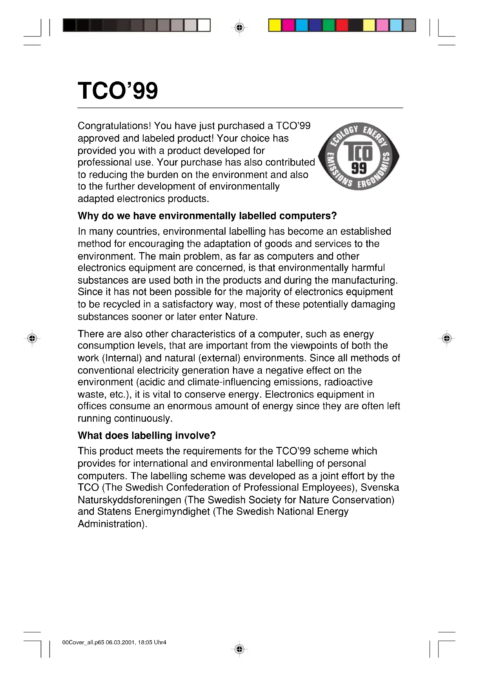 - Bio-accumulative is defined as substances which accumulate within living organisms. ** Lead, Cadmium and Mercury are heavy metals which are Bio- accumulative. To obtain complete information on the environmental criteria document, order from: TCO Development Unit SE-114 94 Stockholm SWEDEN FAX Number: +46 8 782 92 07 E-mail (Internet): development@tco.se You may also obtain current information on TCO’ 99 approved and labelled products by visiting their website at: http://www.tco-info.com/ 00Cover_all.p65 06.03.2001, 18:05 Uhr6English âesky Deutsch