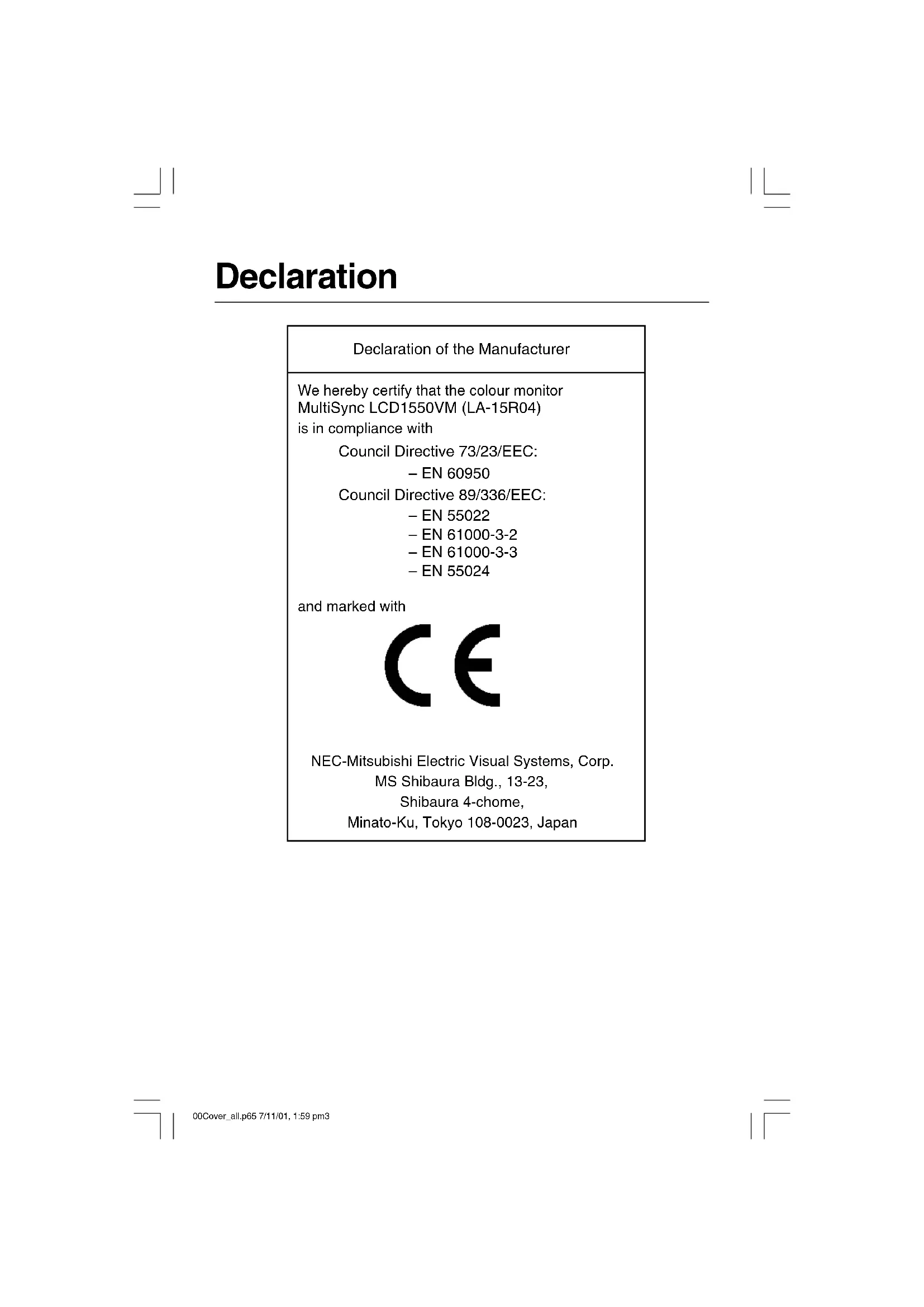 MultiSync LCD1550VM User’s Manual UÏivatelská pfiíruãka Bedienerhandbuch Οδηγίες Χρήσης Manual del usuario Manuel Utilisateur Manuale utente Gebruikershandleiding Podr´cznik u˝ytkownika Руководство пользователя Kullan∂c∂ Klavuzu 00Cover_all.p65 7/11/01, 1:59 pm100Cover_all.p65 7/11/01, 1:59 pm2Declaration Declaration of the Manufacturer We hereby certify that the colour monitor MultiSync LCD1550VM (LA-15R04) is in compliance with Council Directive 73/23/EEC: – EN 60950 Council Directive 89/336/EEC: – EN 55022 – EN 61000-3-2 – EN 61000-3-3 – EN 55024 and marked with NEC-Mitsubishi Electric Visual Systems, Corp. MS Shibaura Bldg., 13-23, Shibaura 4-chome, Minato-Ku, Tokyo 108-0023, Japan 00Cover_all.p65 7/11/01, 1:59 pm3TCO’99 This is a translation of the original English TCO'99 document. MultiSync LCD1550VM (LA-15R04) Congratulations! You have just purchased a TCO’99 approved and labeled product! Your choice has provided you with a product developed for professional use. Your purchase has also contributed to reducing the burden on the environment and also to the further development of environmentally adapted electronics products. Why do we have environmentally labelled computers? In many countries, environmental labelling has become an established method for encouraging the adaptation of goods and services to the environment. The main problem, as far as computers and other electronics equipment are concerned, is that environmentally harmful substances are used both in the products and during the manufacturing. Since it has not been possible for the majority of electronics equipment to be recycled in a satisfactory way, most of these potentially damaging substances sooner or later enter Nature. There are also other characteristics of a computer, such as energy consumption levels, that are important from the viewpoints of both the work (Internal) and natural (external) environments. Since all methods of conventional electricity generation have a negative effect on the environment (acidic and climate-influencing emissions, radioactive waste, etc.), it is vital to conserve energy. Electronics equipment in offices consume an enormous amount of energy since they are often left running continuously. What does labelling involve? This product meets the requirements for the TCO’99 scheme which provides for international and environmental labelling of personal computers. The labelling scheme was developed as a joint effort by the TCO (The Swedish Confederation of Professional Employees), Svenska Naturskyddsforeningen (The Swedish Society for Nature Conservation) and Statens Energimyndighet (The Swedish National Energy Administration). 00Cover_all.p65 7/11/01, 1:59 pm4The requirements cover a wide range of issues: environment, ergonomics, usability, emission of electrical and magnetic fields, energy consumption and electrical and fire safety. The environmental demands concern restrictions on the presence and use of heavy metals, brominated and chlorinated flame retardants, CFCs (freons) and chlorinated solvents, among other things. The product must be prepared for recycling and the manufacturer is obliged to have an environmental plan which must be adhered to in each country where the company implements its operational policy. The energy requirements include a demand that the computer and/or display, after a certain period of inactivity, shall reduce its power consumption to a lower level in one or more stages. The length of time to reactivate the computer shall be reasonable for the user. Labelled products must meet strict environmental demands, for example, in respect of the reduction of electric and magnetic fields, physical and visual ergonomics and good usability. Environmental Requirements Flame retardants Flame retardants are present in printed circuit boards, cables, wires, casings and housings. In turn, they delay the spread of fire. Up to thirty percent of the plastic in a computer casing can consist of flame retardant substances. Most flame retardants contain bromine or chloride and these are related to another group of environmental toxins, PCBs, which are suspected to give rise to severe health effects, including reproductive damage in fisheating birds and mammals, due to the bioaccumulative* processes. Flame retardants have been found in human blood and researchers fear that disturbances in foetus development may occur. TCO’99 demand requires that plastic components weighing more than 25 grams must not contain flame retardants with organically bound chlorine and bromine. Flame retardants are allowed in the printed circuit boards since no substitutes are available. Lead** Lead can be found in picture tubes, display screens, solders and capacitors. Lead damages the nervous system and in higher doses, causes lead poisoning. TCO’99 requirement permits the inclusion of lead since no replacement has yet been developed. 00Cover_all.p65 7/11/01, 1:59 pm5Cadmium** Cadmium is present in rechargeable batteries and in the colourgenerating layers of certain computer displays. Cadmium damages the nervous system and is toxic in high doses. TCO’99 requirement states that batteries, the colourgenerating layers of display screens and the electrical or electronics components must not contain any cadmium. Mercury** Mercury is sometimes found in batteries, relays and switches, Mercury damages the nervous system and is toxic in high doses. TCO’99 requirement states that batteries may not contain any Mercury. It also demands that no mercury is present in any of the electrical or electronics components associated with the display unit. CFCs (freons) CFCs (freons) are sometimes used for washing printed circuit boards. CFCs break down ozone and thereby damage the ozone layer in the stratosphere, causing increased reception on Earth of ultraviolet light with consequent increased risks of skin cancer (malignant melanoma). The relevant TCO’99