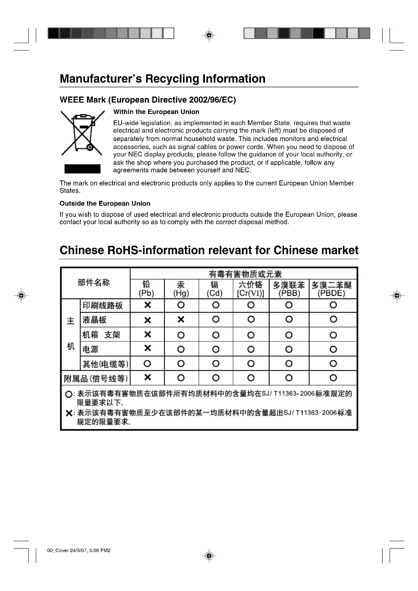 LCD19WV LCD22WV User’s Manual Bedienerhandbuch Manual del usuario Manuel Utilisateur Manuale utente Руководство пользователя Kullan∂c∂ Kılavuzu 00_Cover 24/9/07, 5:06 PM1Chinese RoHS-information relevant for Chinese market WEEE Mark (European Directive 2002/96/EC) Within the European Union EU-wide legislation, as implemented in each Member State, requires that waste electrical and electronic products carrying the mark (left) must be disposed of separately from normal household waste. This includes monitors and electrical accessories, such as signal cables or power cords. When you need to dispose of your NEC display products, please follow the guidance of your local authority, or ask the shop where you purchased the product, or if applicable, follow any agreements made between yourself and NEC. The mark on electrical and electronic products only applies to the current European Union Member States. Outside the European Union If you wish to dispose of used electrical and electronic products outside the European Union, please contact your local authority so as to comply with the correct disposal method. Manufacturer’s Recycling Information 00_Cover 24/9/07, 5:06 PM2English-1 English Declaration of the Manufacturer We hereby certify that the colour monitor LCD19WV (TFT19W80PS)/ LCD22WV (TFT22W90PS) are in compliance with RISK OF ELECTRIC SHOCK • DO NOT OPEN TO PREVENT FIRE OR SHOCK HAZARDS, DO NOT EXPOSE THIS UNIT TO RAIN OR MOISTURE. ALSO, DO NOT USE THIS UNIT’S POLARIZED PLUG WITH AN EXTENSION CORD RECEPTACLE OR OTHER OUTLETS UNLESS THE PRONGS CAN BE FULLY INSERTED. REFRAIN FROM OPENING THE CABINET AS THERE ARE HIGH VOLTAGE COMPONENTS INSIDE. REFER SERVICING TO QUALIFIED SERVICE PERSONNEL. WARNING CAUTION: TO REDUCE THE RISK OF ELECTRIC SHOCK, DO NOT REMOVE COVER (OR BACK). NO USER