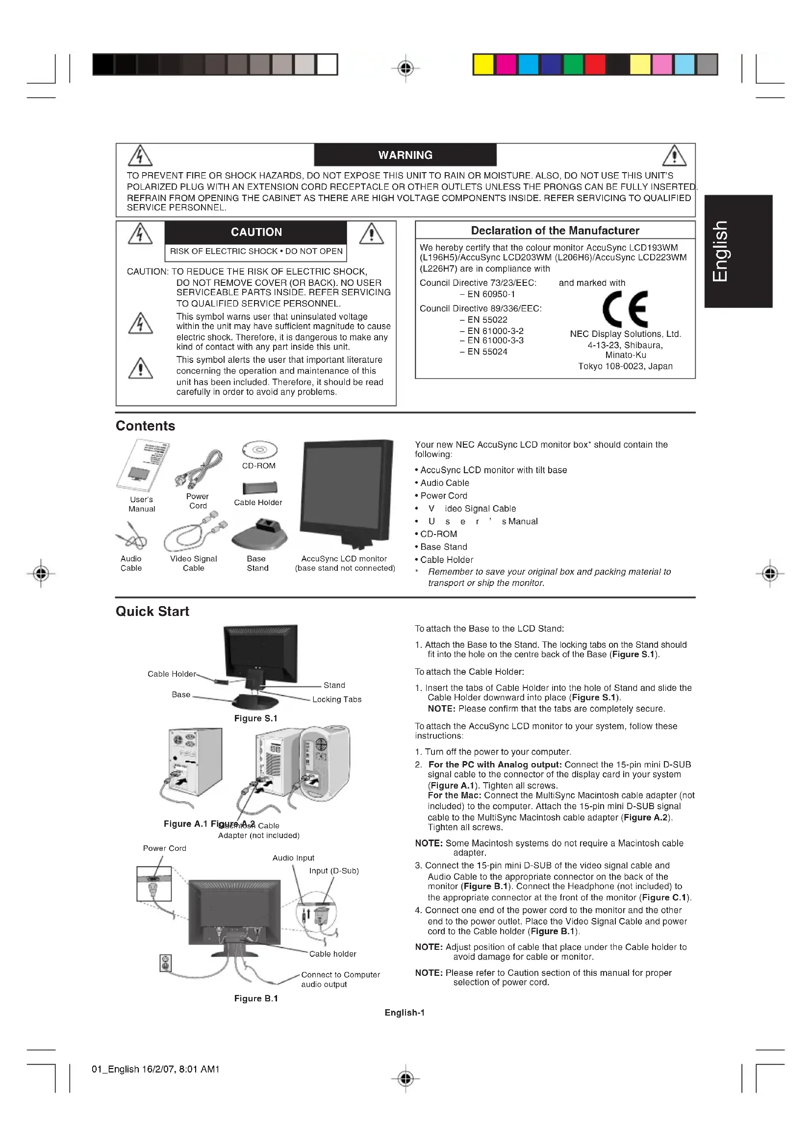 - Restrictions on: - chlorinated and brominated flame retardants and polymers - heavy metals such as cadmium, mercury and lead. The requirements included in this label have been developed by TCO Development in co-operation with scientists, experts, users as well as manufacturers all over the world. Since the end of the 1980s TCO has been involved in influencing the development of IT equipment in a more user- friendly direction. Our labelling system started with displays in 1992 and is now requested by users and IT-manufacturers all over the world. For more information, please visit www.tcodevelopment.com 00_Cover 16/2/07, 8:00 AM2WEEE Mark (European Directive 2002/96/EC) Within the European Union EU-wide legislation, as implemented in each Member State, requires that waste electrical and electronic products carrying the mark (left) must be disposed of separately from normal household waste. This includes monitors and electrical accessories, such as signal cables or power cords. When you need to dispose of your NEC display products, please follow the guidance of your local authority, or ask the shop where you purchased the product, or if applicable, follow any agreements made between yourself and NEC. The mark on electrical and electronic products only applies to the current European Union Member States. Outside the European Union If you wish to dispose of used electrical and electronic products outside the European Union, please contact your local authority so as to comply with the correct disposal method. Manufacturer’s Recycling and Energy Information NEC DISPLAY SOLUTIONS is strongly committed to environmental protection and sees recycling as one of the company’s top priorities in trying to minimize the burden placed on the environment. We are engaged in developing environmentally-friendly products, and always strive to help define and comply with the latest independent standards from agencies such as ISO (International Organisation for Standardization) and TCO (Swedish Trades Union). Disposing of your old NEC product The aim of recycling is to gain an environmental benefit by means of re-use, upgrading, reconditioning or reclamation of material. Dedicated recycling sites ensure that environmentally harmful components are properly handled and securely disposed. To ensure the best recycling of our products, NEC DISPLAY SOLUTIONS offers a variety of recycling procedures and gives advice on how to handle the product in an environmentally sensitive way, once it has reached the end of its life. All required information concerning the disposal of the product and country-specific information on recycling facilities can be found on our following websites: http://www.nec-display-solutions.com/greencompany/ (in Europe), http://www.nec-display.com (in Japan) or http://www.necdisplay.com (in USA). Energy Saving This monitor features an advanced energy saving capability. When a VESA Display Power Management Signalling (DPMS) Standard signal is sent to the monitor, the Energy Saving mode is activated. The monitor enters a single Energy Saving mode. Mode Power consumption LED colour Normal Operation Approx. 39W (LCD193WM), Approx. 49W (LCD203WM), Approx. 55W (LCD223WM) Green Energy Saving Mode Less than 2W Amber Off Mode Less than 1W Unlit 00_Cover 16/2/07, 8:00 AM3Chinese RoHS-information relevant for Chinese market 00_Cover 16/2/07, 8:00 AM4English-1 English Declaration of the Manufacturer We hereby certify that the colour monitor AccuSync LCD193WM(L196H5)/AccuSync LCD203WM (L206H6)/AccuSync LCD223WM(L226H7) are in compliance withCouncil Directive 73/23/EEC:– EN 60950-1Council Directive 89/336/EEC:– EN 55022– EN 61000-3-2– EN 61000-3-3– EN 55024RISK OF ELECTRIC SHOCK • DO NOT OPEN TO PREVENT FIRE OR SHOCK HAZARDS, DO NOT EXPOSE THIS UNIT TO RAIN OR MOISTURE. ALSO, DO NOT USE THIS UNIT’S POLARIZED PLUG WITH AN EXTENSION CORD RECEPTACLE OR OTHER OUTLETS UNLESS THE PRONGS CAN BE FULLY INSERTED.REFRAIN FROM OPENING THE CABINET AS THERE ARE HIGH VOLTAGE COMPONENTS INSIDE. REFER SERVICING TO QUALIFIEDSERVICE PERSONNEL. WARNING CAUTION: TO REDUCE THE RISK OF ELECTRIC SHOCK,DO NOT REMOVE COVER (OR BACK). NO USERSERVICEABLE PARTS INSIDE. REFER SERVICINGTO QUALIFIED SERVICE PERSONNEL.This symbol warns user that uninsulated voltagewithin the unit may have sufficient magnitude to causeelectric shock. Therefore, it is dangerous to make anykind of contact with any part inside this unit.This symbol alerts the user that important literatureconcerning the operation and maintenance of thisunit has been included. Therefore, it should be readcarefully in order to avoid any problems. CAUTION and marked withNEC Display Solutions, Ltd.4-13-23, Shibaura,Minato-KuTokyo 108-0023, Japan Contents Your new NEC AccuSync LCD monitor box* should contain thefollowing:• AccuSync LCD monitor with tilt base• Audio Cable• Power Cord•Video Signal Cable•User’s Manual• CD-ROM• Base Stand• Cable Holder