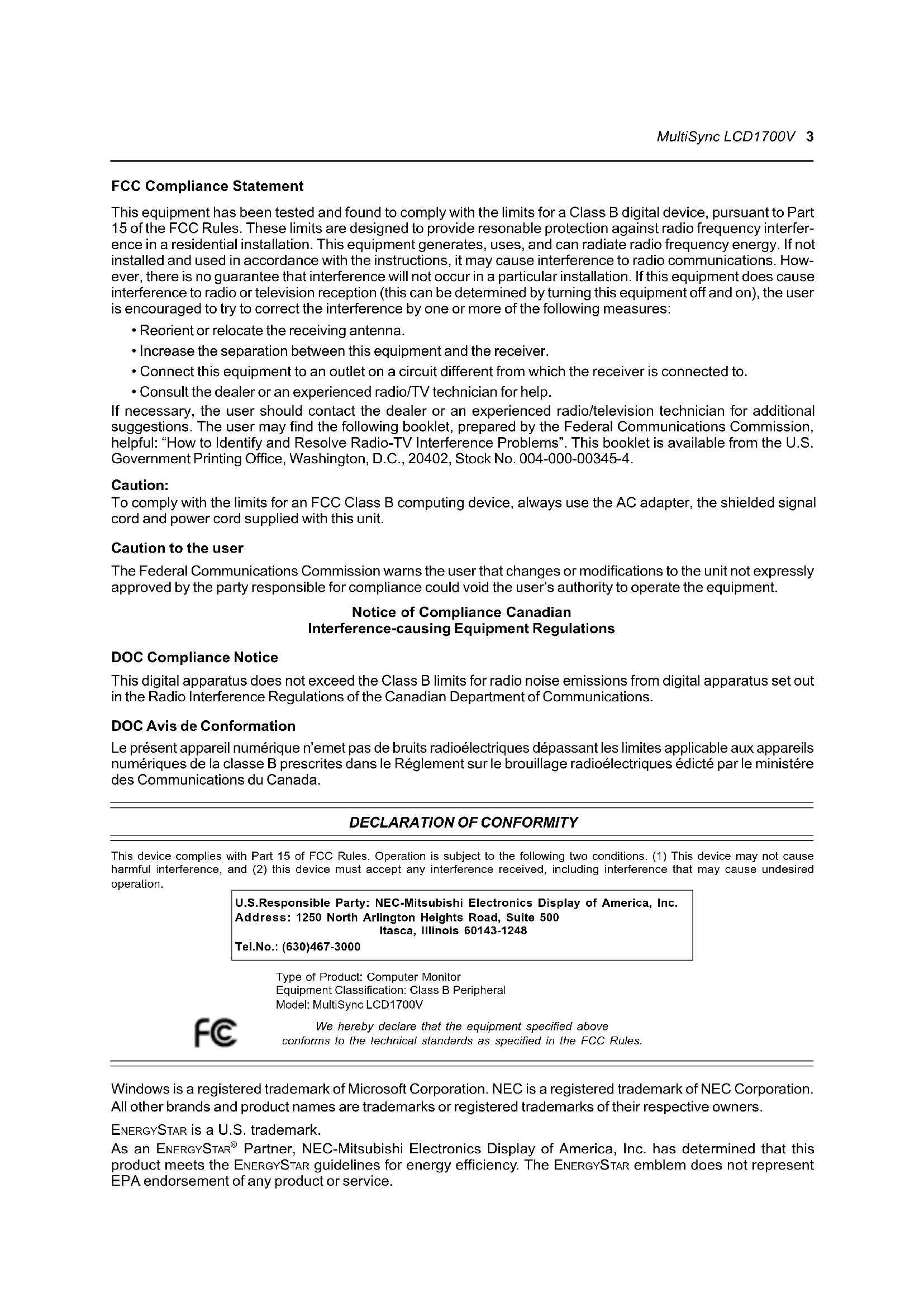 - Consult the dealer or an experienced radio/TV technician for help. If necessary, the user should contact the dealer or an experienced radio/television technician for additional suggestions. The user may find the following booklet, prepared by the Federal Communications Commission, helpful: “How to Identify and Resolve Radio-TV Interference Problems”. This booklet is available from the U.S. Government Printing Office, Washington, D.C., 20402, Stock No. 004-000-00345-4. Caution: To comply with the limits for an FCC Class B computing device, always use the AC adapter, the shielded signal cord and power cord supplied with this unit. Caution to the user The Federal Communications Commission warns the user that changes or modifications to the unit not expressly approved by the party responsible for compliance could void the user’s authority to operate the equipment. Notice of Compliance Canadian Interference-causing Equipment Regulations DOC Compliance Notice This digital apparatus does not exceed the Class B limits for radio noise emissions from digital apparatus set out in the Radio Interference Regulations of the Canadian Department of Communications. DOC Avis de Conformation Le présent appareil numérique n’emet pas de bruits radioélectriques dépassant les limites applicable aux appareils numériques de la classe B prescrites dans le Réglement sur le brouillage radioélectriques édicté par le ministére des Communications du Canada. U.S.Responsible Party: NEC-Mitsubishi Electronics Display of America, Inc. Address: 1250 North Arlington Heights Road, Suite 500 Itasca, Illinois 60143-1248 Tel.No.: (630)467-3000 Type of Product: Computer Monitor Equipment Classification: Class B Peripheral Model: MultiSync LCD1700V We hereby declare that the equipment specified above conforms to the technical standards as specified in the FCC Rules.
