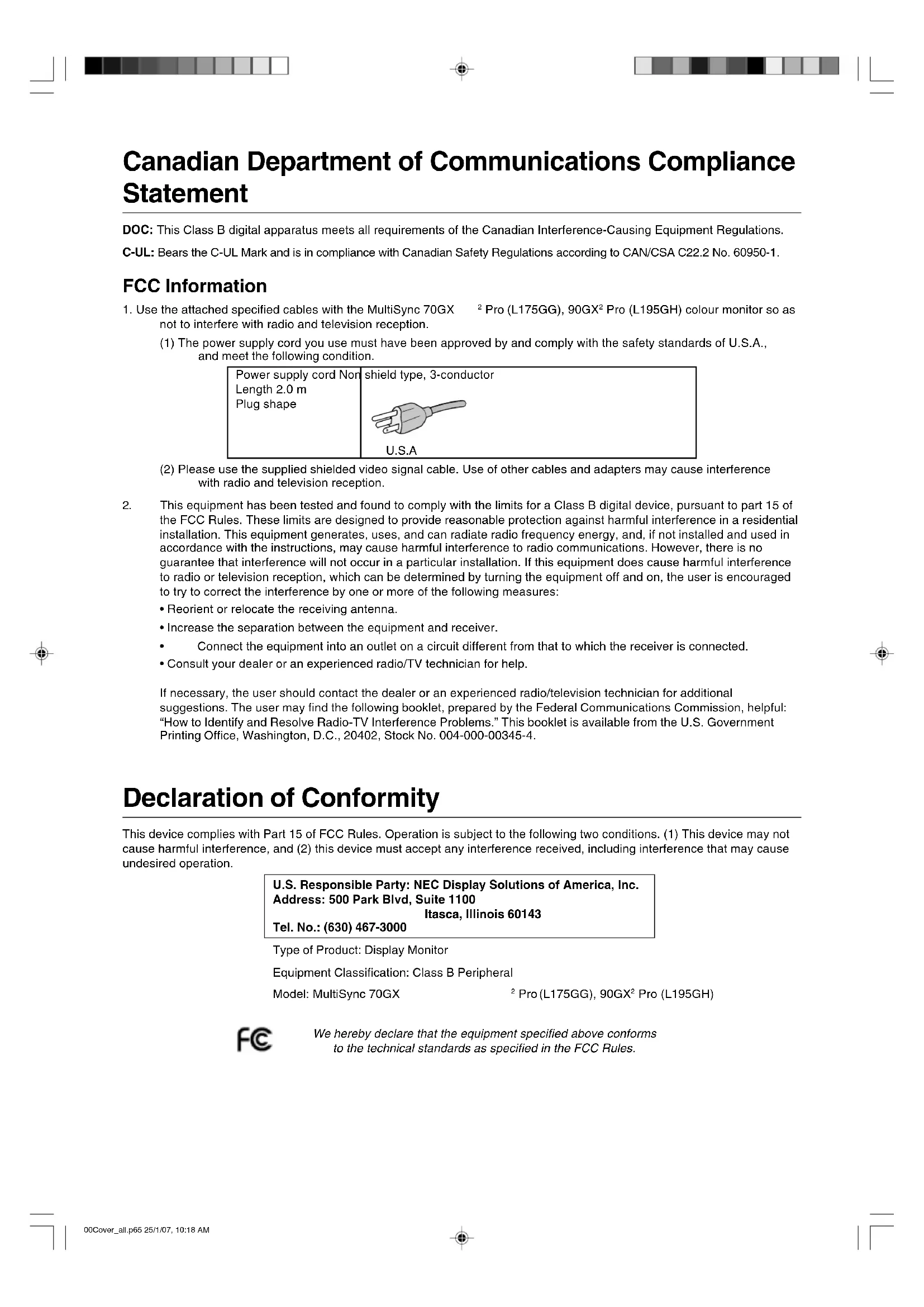 - Consult your dealer or an experienced radio/TV technician for help. If necessary, the user should contact the dealer or an experienced radio/television technician for additional suggestions. The user may find the following booklet, prepared by the Federal Communications Commission, helpful: “How to Identify and Resolve Radio-TV Interference Problems.” This booklet is available from the U.S. Government Printing Office, Washington, D.C., 20402, Stock No. 004-000-00345-4. Declaration of Conformity This device complies with Part 15 of FCC Rules. Operation is subject to the following two conditions. (1) This device may not cause harmful interference, and (2) this device must accept any interference received, including interference that may cause undesired operation. U.S. Responsible Party: NEC Display Solutions of America, Inc. Address: 500 Park Blvd, Suite 1100 Itasca, Illinois 60143 Tel. No.: (630) 467-3000 Type of Product: Display Monitor Equipment Classification: Class B Peripheral Model: MultiSync 70GX