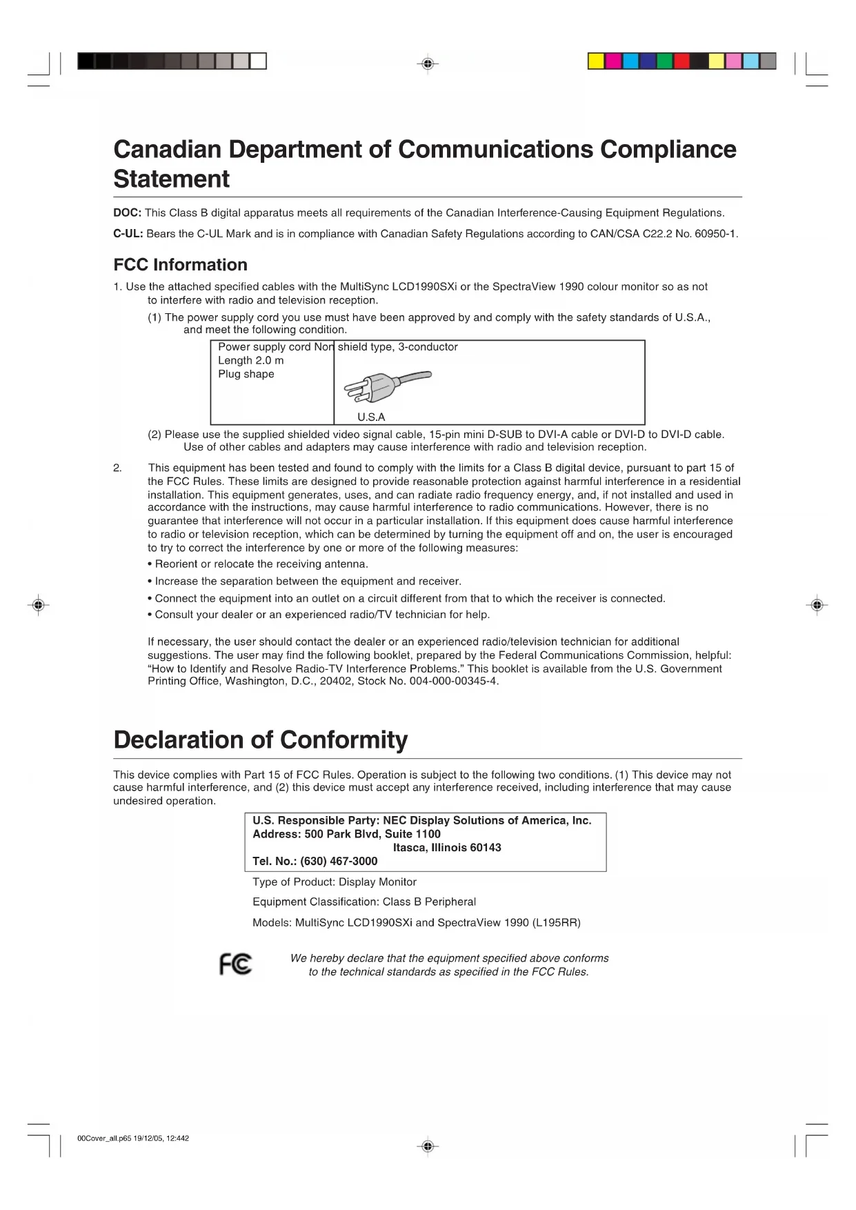 - Consult your dealer or an experienced radio/TV technician for help. If necessary, the user should contact the dealer or an experienced radio/television technician for additional suggestions. The user may find the following booklet, prepared by the Federal Communications Commission, helpful: “How to Identify and Resolve Radio-TV Interference Problems.” This booklet is available from the U.S. Government Printing Office, Washington, D.C., 20402, Stock No. 004-000-00345-4. Declaration of Conformity This device complies with Part 15 of FCC Rules. Operation is subject to the following two conditions. (1) This device may not cause harmful interference, and (2) this device must accept any interference received, including interference that may cause undesired operation. U.S. Responsible Party: NEC Display Solutions of America, Inc. Address: 500 Park Blvd, Suite 1100 Itasca, Illinois 60143 Tel. No.: (630) 467-3000 Type of Product: Display Monitor Equipment Classification: Class B Peripheral Models: MultiSync LCD1990SXi and SpectraView 1990 (L195RR) We hereby declare that the equipment specified above conforms to the technical standards as specified in the FCC Rules. 00Cover_all.p65 19/12/05, 12:442TCO’03 Congratulations! The display you have just purchased carries the TCO’03 Displays label. This means that your display is designed, manufactured and tested according to some of the strictest quality and environmental requirements in the world. This makes for a high performance product, designed with the user in focus that also minimizes the impact on our natural environment. Some of the features of the TCO’03 Display requirements: Ergonomics