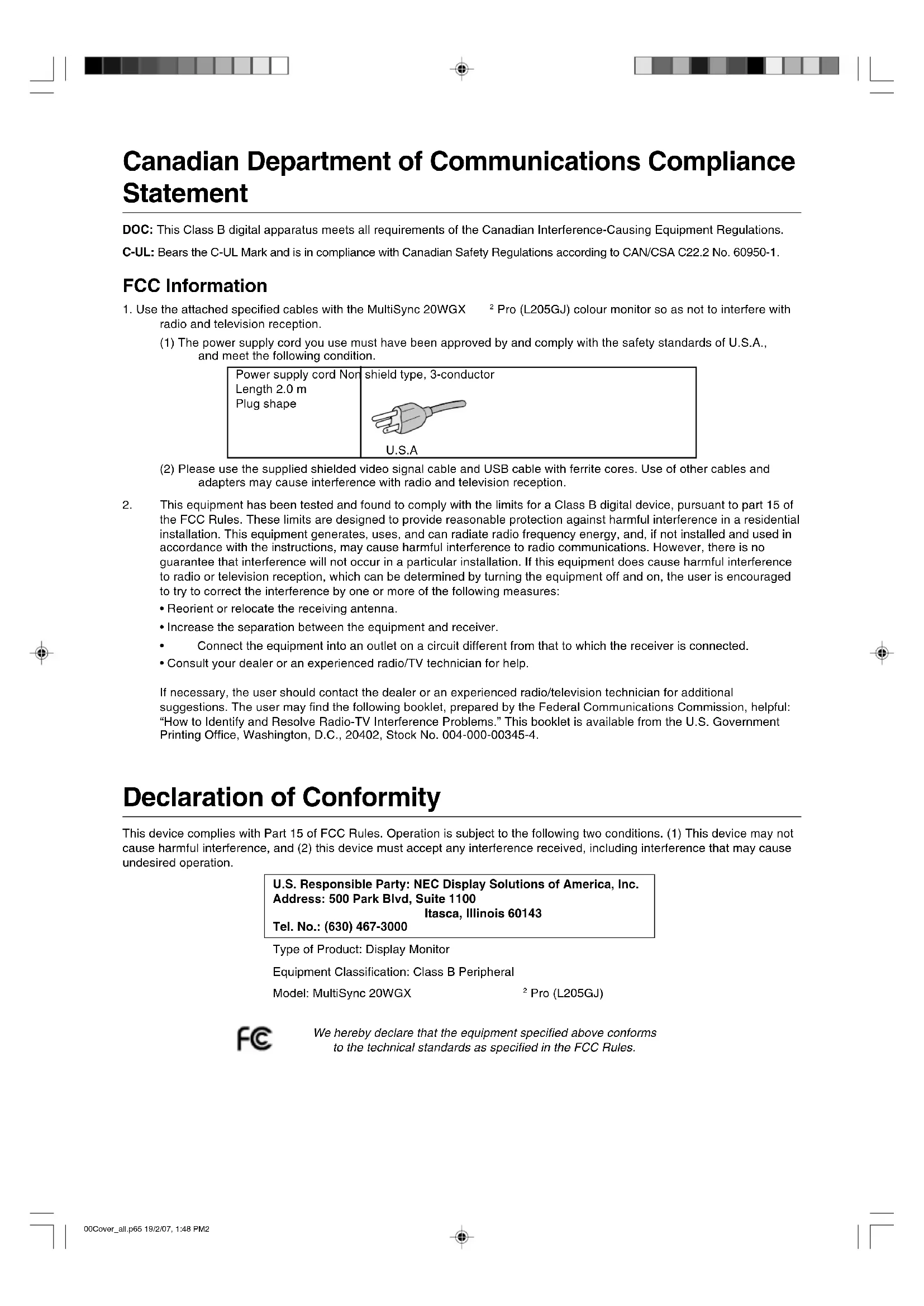 - Consult your dealer or an experienced radio/TV technician for help. If necessary, the user should contact the dealer or an experienced radio/television technician for additional suggestions. The user may find the following booklet, prepared by the Federal Communications Commission, helpful: “How to Identify and Resolve Radio-TV Interference Problems.” This booklet is available from the U.S. Government Printing Office, Washington, D.C., 20402, Stock No. 004-000-00345-4. Declaration of Conformity This device complies with Part 15 of FCC Rules. Operation is subject to the following two conditions. (1) This device may not cause harmful interference, and (2) this device must accept any interference received, including interference that may cause undesired operation. U.S. Responsible Party: NEC Display Solutions of America, Inc. Address: 500 Park Blvd, Suite 1100 Itasca, Illinois 60143 Tel. No.: (630) 467-3000 Type of Product: Display Monitor Equipment Classification: Class B Peripheral Model: MultiSync 20WGX