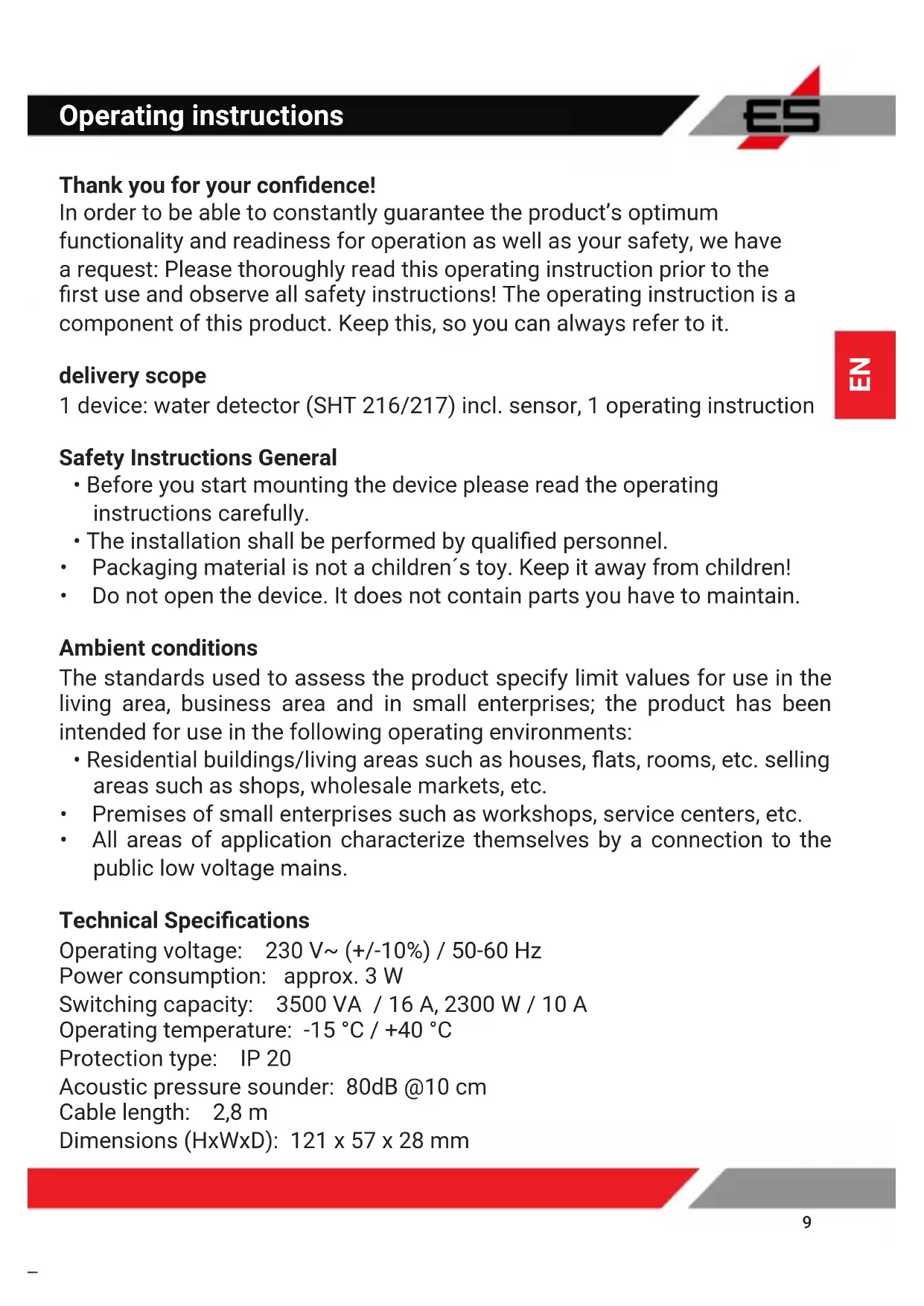 Sensor installation The sensor reacts to water contact at the two metal contacts. The assembly height of the sensor de- nes, at what level the water detector will sound an alarm. For quick warning in case of water ingress, you mount the sensor close to the oor, so both sensor contacts touch the ground. For installing the sensor use the provided assembly material. Startup The SHT 216 water detector just has to be plugged into the socket (230 V AC / 50-60 Hz). Connect the power plug of the washing machine or dish washer to the earthed socket of the SHT 216. The locking of the power plug helps to avoid unintended removal of the device plug. The LED (Func- tion) lights up green and signals that the device is ready for use. Alarm As soon as the sensor has contact with water, an acoustic and an optic alarm signal sounds. The LED lights up red. The device connected is deac- tivated. The alarm remains active until Aquastop SHT 216 is disconnected from the power line and the water doesn’t contact the sensor any more. Function Test Function test of the device: touch both sensor contacts with a waterlogged cloth or an electric conductive metal and the alarm is set off immediately. SHT 216 Sensor SHT 216 EN11 SHT 217 Sensor sump shaft pump SHT 217 Follow-up time100 - 0 s (gure 2)(gure 1) The device connected is deactivated. The alarm is deactivated as soon as you briey disconnect Aquastop SHT 216 from the power line and remove the cloth from the metal contacts. For your safety, we recommend that you carry out this test cons- tantly! Appopriate use The water detector SHT 217 (pump control) is a device for detecting water level changes and for monitoring sump shafts. When the sensor gets in contact with water, an audible and/or visual alarm signal is raised and a pump connected is activated. The follow-up time of the pump can be adjusted to a value between 0 and 100 seconds using the thumb wheel. The device may only be used as previously described. Installation Instruction The device is not approved for use other than described above. For pump sumps we recommend the SHT 227 or 228 water detectors. Sensor installation The sensor reacts to water contact at the two metal contacts. The mounting position of the sensor denes when the pump should be activated by the device SHT 217 (gure 1). EN12 SHT 217 Startup The SHT 217 water detector just has to be plugged into the socket (230 V AC / 50-60 Hz). Connect the power plug of the pump to the earthed socket of the SHT 217. The locking of the power plug helps to avoid unintended removal of the device plug. The LED (Function) lights up green and signals that the device is ready for use. The follow-up time of the pump can be adjusted steplessly to a value bet- ween 0 and 100 seconds using the thumb wheel on the back of the device (gure 2). After triggering the alarm, the set follow-up time only becomes active once the water level has fallen beneath the level of the water sensor during pumping down. When setting the follow-up time please note that the pump doesn’t idle after pumping down the water. This can cause damage to the pump. Alarm As soon as the sensor has contact with water, an acoustic and an optic alarm signal sounds. The LED lights up red. The LED illuminates in red in the process and at the same time the pump connected is activated. If the water level falls beneath the level of the water sensor the LED ashes in red and the set follow-up time of the pump is activated. Once the follow-up time elapsed the pump is deactivated and the LED illuminates in green. Function test Functional test of the device: You can test the function of the system by lling the sump shaft with water. For your safety, we recommend that you carry out this test constantly! General Elektrotechnik Schabus GmbH & Co. KG is not liable for damages and/or losses of any kind such as individual damages or consequential damages brought about by the water detector not issuing an alarm despite any changes in water conditions. EN13
