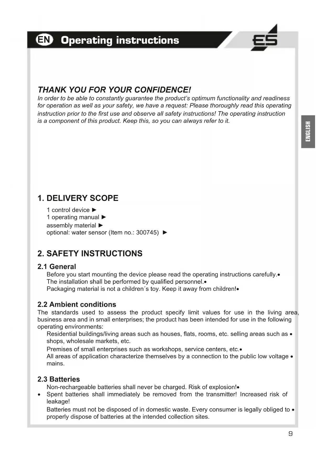 Non-rechargeable batteries shall never be charged. Risk of explosion!• Spent batteries shall immediately be removed from the transmitter! Increased risk of • leakage! Batteries must not be disposed of in domestic waste. Every consumer is legally obliged to • properly dispose of batteries at the intended collection sites. Operating instructions