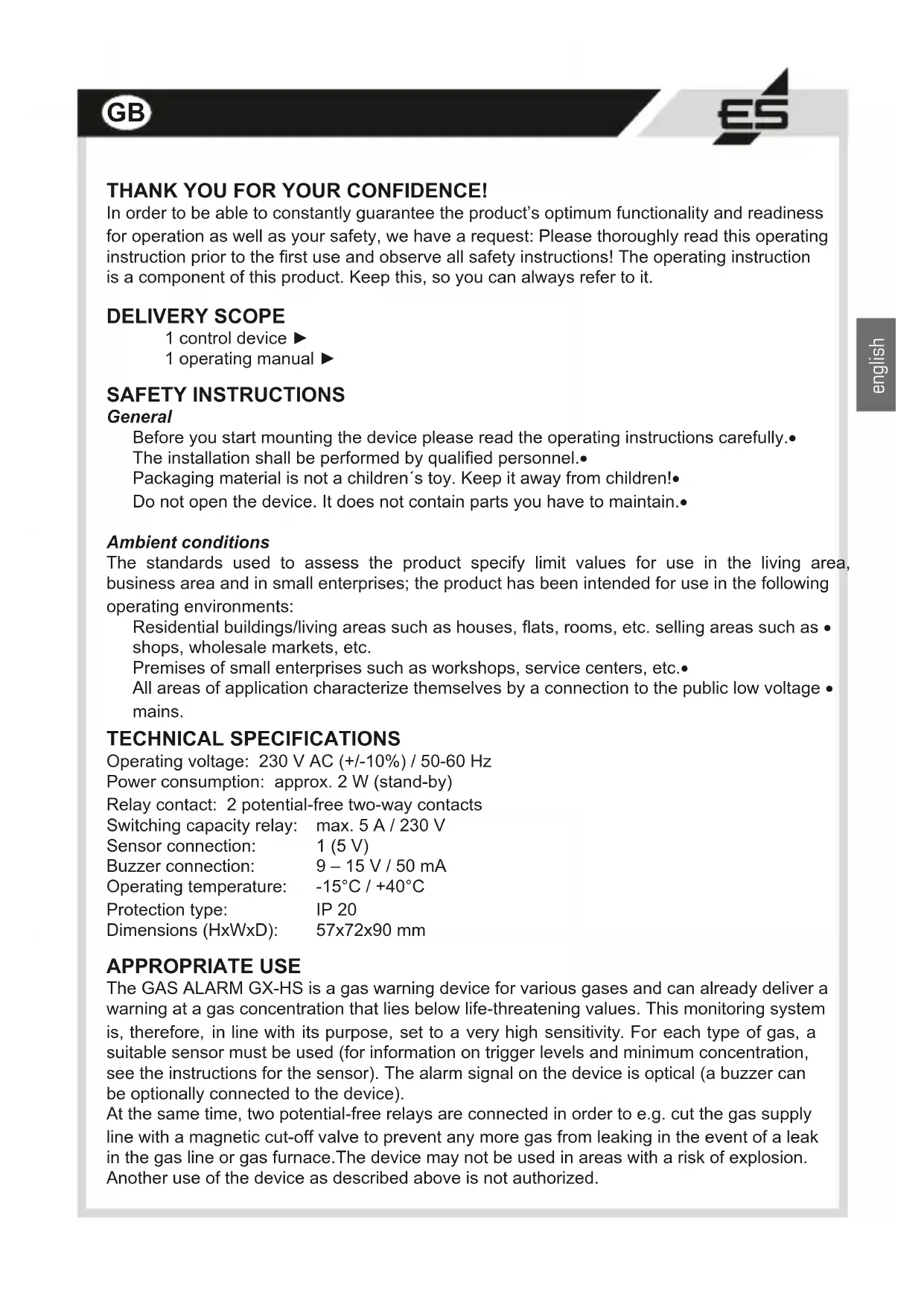THANK YOU FOR YOUR CONFIDENCE! In order to be able to constantly guarantee the product’s optimum functionality and readiness for operation as well as your safety, we have a request: Please thoroughly read this operating instruction prior to the rst use and observe all safety instructions! The operating instruction is a component of this product. Keep this, so you can always refer to it. SAFETY INSTRUCTIONS General Before you start mounting the device please read the operating instructions carefully.• The installation shall be performed by qualied personnel.• Packaging material is not a children´s toy. Keep it away from children!• Do not open the device. It does not contain parts you have to maintain.• Ambient conditions The standards used to assess the product specify limit values for use in the living area, business area and in small enterprises; the product has been intended for use in the following operating environments: Residential buildings/living areas such as houses, ats, rooms, etc. selling areas such as • shops, wholesale markets, etc. Premises of small enterprises such as workshops, service centers, etc.• All areas of application characterize themselves by a connection to the public low voltage • mains. DELIVERY SCOPE 1 control device ► 1 operating manual ► TECHNICAL SPECIFICATIONS Operating voltage: 230 V AC (+/-10%) / 50-60 Hz Power consumption: approx. 2 W (stand-by) Relay contact: 2 potential-free two-way contacts Switching capacity relay: max. 5 A / 230 V Sensor connection: 1 (5 V) Buzzer connection: 9 – 15 V / 50 mA Operating temperature: -15°C / +40°C Protection type: IP 20 Dimensions (HxWxD): 57x72x90 mm APPROPRIATE USE The GAS ALARM GX-HS is a gas warning device for various gases and can already deliver a warning at a gas concentration that lies below life-threatening values. This monitoring system is, therefore, in line with its purpose, set to a very high sensitivity. For each type of gas, a suitable sensor must be used (for information on trigger levels and minimum concentration, see the instructions for the sensor). The alarm signal on the device is optical (a buzzer can be optionally connected to the device). At the same time, two potential-free relays are connected in order to e.g. cut the gas supply line with a magnetic cut-off valve to prevent any more gas from leaking in the event of a leak in the gas line or gas furnace.The device may not be used in areas with a risk of explosion. Another use of the device as described above is not authorized.english INSTALLATION INSTRUCTIONS The GAS ALARM GX-HS and the sensor may be installed only in dry, interior rooms and must be correctly placed according to the type of gas to ensure faultless operation of the alarm system. It is essential to observe the prescribed mounting height! Please note the operating instructions of the sensor you wish to use and you will see the specied mounting height! The installation shall be performed by qualied personel. Please note the ve safety rules!