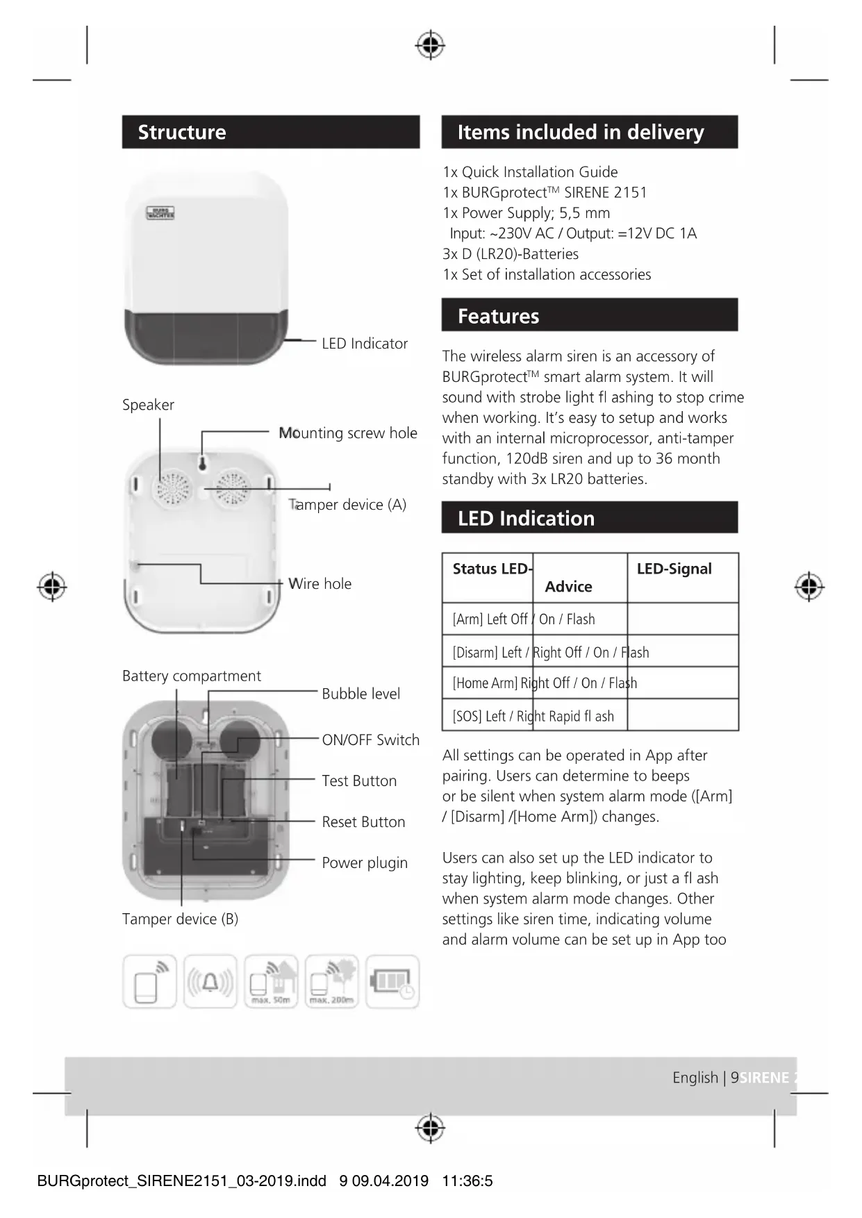 smart alarm system. It will sound with strobe light ashing to stop crime when working. It’s easy to setup and works with an internal microprocessor, anti-tamper function, 120dB siren and up to 36 month standby with 3x LR20 batteries. Items included in delivery Features LED Indication All settings can be operated in App after pairing. Users can determine to beeps or be silent when system alarm mode ([Arm] / [Disarm] /[Home Arm]) changes. Users can also set up the LED indicator to stay lighting, keep blinking, or just a ash when system alarm mode changes. Other settings like siren time, indicating volume and alarm volume can be set up in App too Status LED- Advice LED-Signal [Arm] Left Off / On / Flash [Disarm] Left / Right Off / On / Flash [Home Arm] Right Off / On / Flash [SOS] Left / Right Rapid fl ash LED Indicator Mounting screw hole Speaker Wire hole Tamper device (A) Mounting screw hole Wire hole Tamper device (A) Tamper device (B) Battery compartment Power plugin Test Button Reset Button ON/OFF Switch Bubble level BA BURGprotect_SIRENE2151_03-2019.indd 9 09.04.2019 11:36:5910 | English SIRENE 2151 Technical data Features