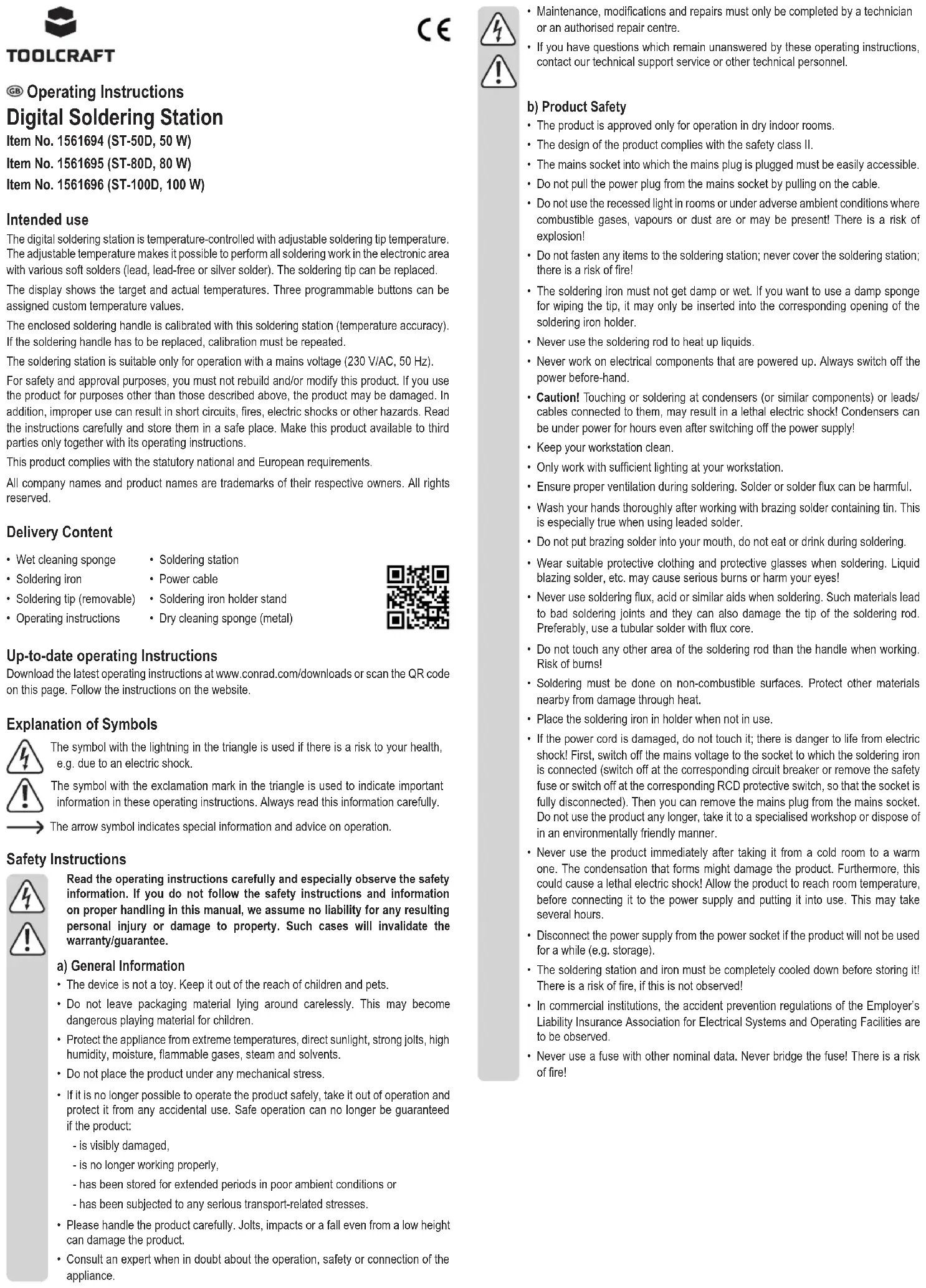 - Never use a fuse with other nominal data. Never bridge the fuse! There is a risk of re! Operating Instructions Digital Soldering Station Item No. 1561694 (ST-50D, 50 W) Item No. 1561695 (ST-80D, 80 W) Item No. 1561696 (ST-100D, 100 W) Intended use The digital soldering station is temperature-controlled with adjustable soldering tip temperature. The adjustable temperature makes it possible to perform all soldering work in the electronic area with various soft solders (lead, lead-free or silver solder). The soldering tip can be replaced. The display shows the target and actual temperatures. Three programmable buttons can be assigned custom temperature values. The enclosed soldering handle is calibrated with this soldering station (temperature accuracy). If the soldering handle has to be replaced, calibration must be repeated. The soldering station is suitable only for operation with a mains voltage (230 V/AC, 50 Hz). For safety and approval purposes, you must not rebuild and/or modify this product. If you use the product for purposes other than those described above, the product may be damaged. In addition, improper use can result in short circuits, res, electric shocks or other hazards. Read the instructions carefully and store them in a safe place. Make this product available to third parties only together with its operating instructions. This product complies with the statutory national and European requirements. All company names and product names are trademarks of their respective owners. All rights reserved. Delivery Content