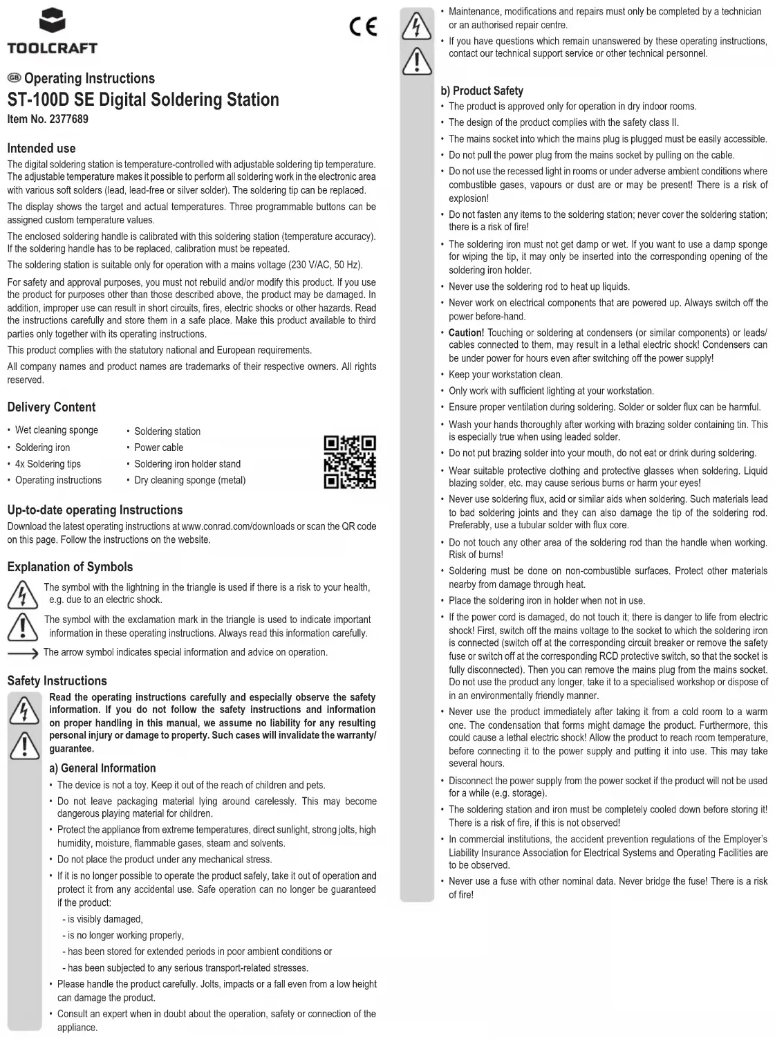 - Dry cleaning sponge (metal) Up-to-date operating Instructions Download the latest operating instructions at www.conrad.com/downloads or scan the QR code on this page. Follow the instructions on the website. Explanation of Symbols The symbol with the lightning in the triangle is used if there is a risk to your health, e.g. due to an electric shock. The symbol with the exclamation mark in the triangle is used to indicate important information in these operating instructions. Always read this information carefully. The arrow symbol indicates special information and advice on operation. Safety Instructions Read the operating instructions carefully and especially observe the safety information. If you do not follow the safety instructions and information on proper handling in this manual, we assume no liability for any resulting personal injury or damage to property. Such cases will invalidate the warranty/ guarantee. a) General Information