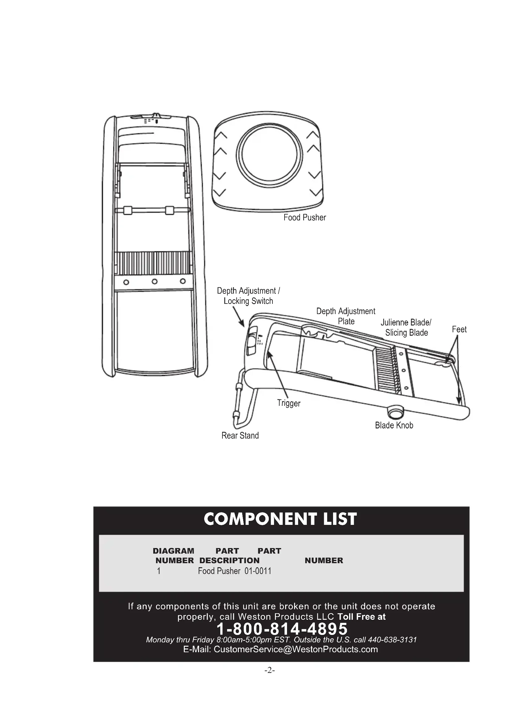 1 Food Pusher 01-0011 If any components of this unit are broken or the unit does not operate properly, call Weston Products LLC Toll Free at 1-800-814-4895 Monday thru Friday 8:00am-5:00pm EST. Outside the U.S. call 440-638-3131 E-Mail: CustomerService@WestonProducts.com Food Pusher Rear Stand Depth Adjustment Plate Blade Knob Depth Adjustment / Locking Switch Julienne Blade/ Slicing Blade Trigger Feet-3-