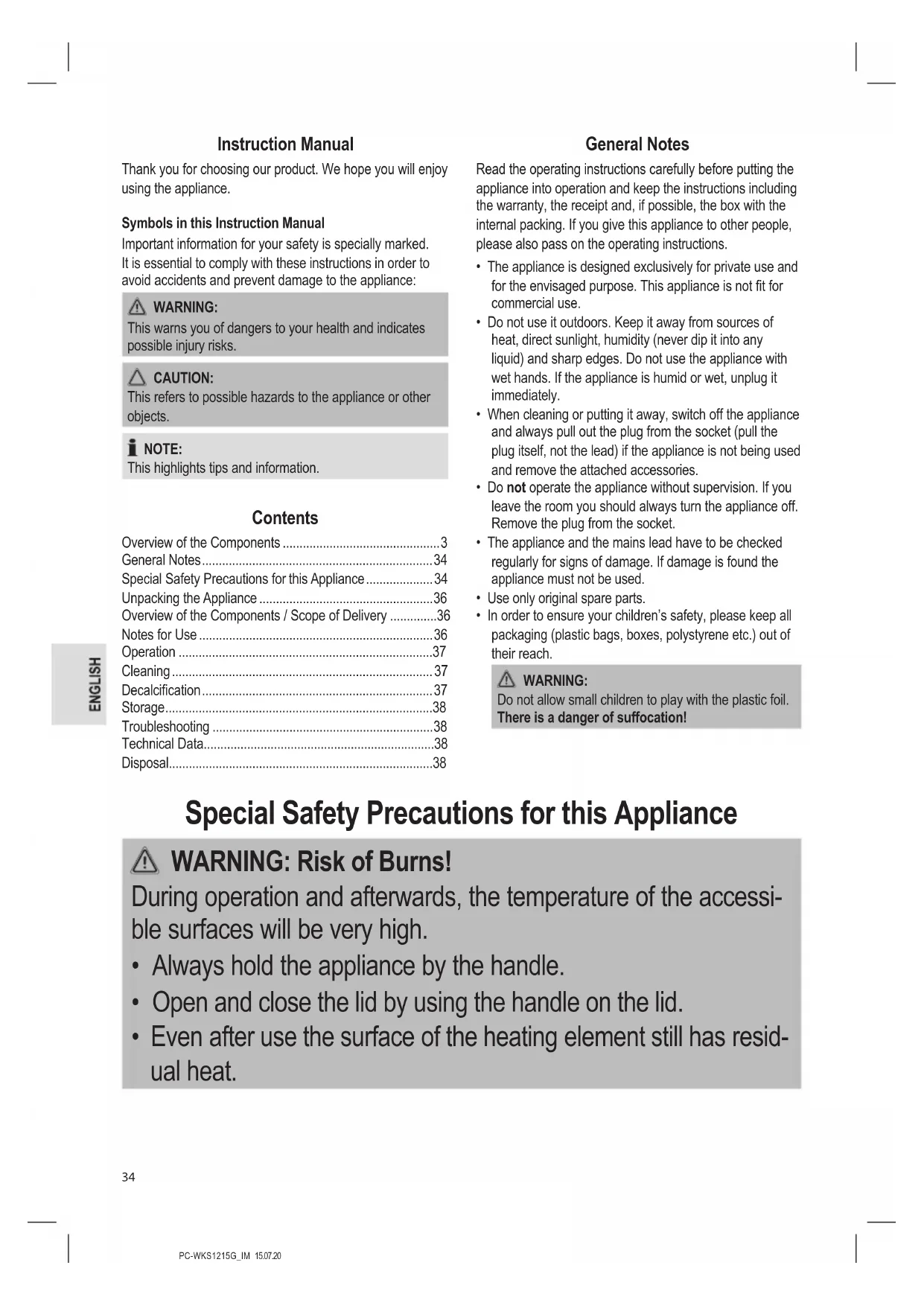 - Even after use the surface of the heating element still has resid- ual heat.PC-WKS1215G_IM 15.07.20