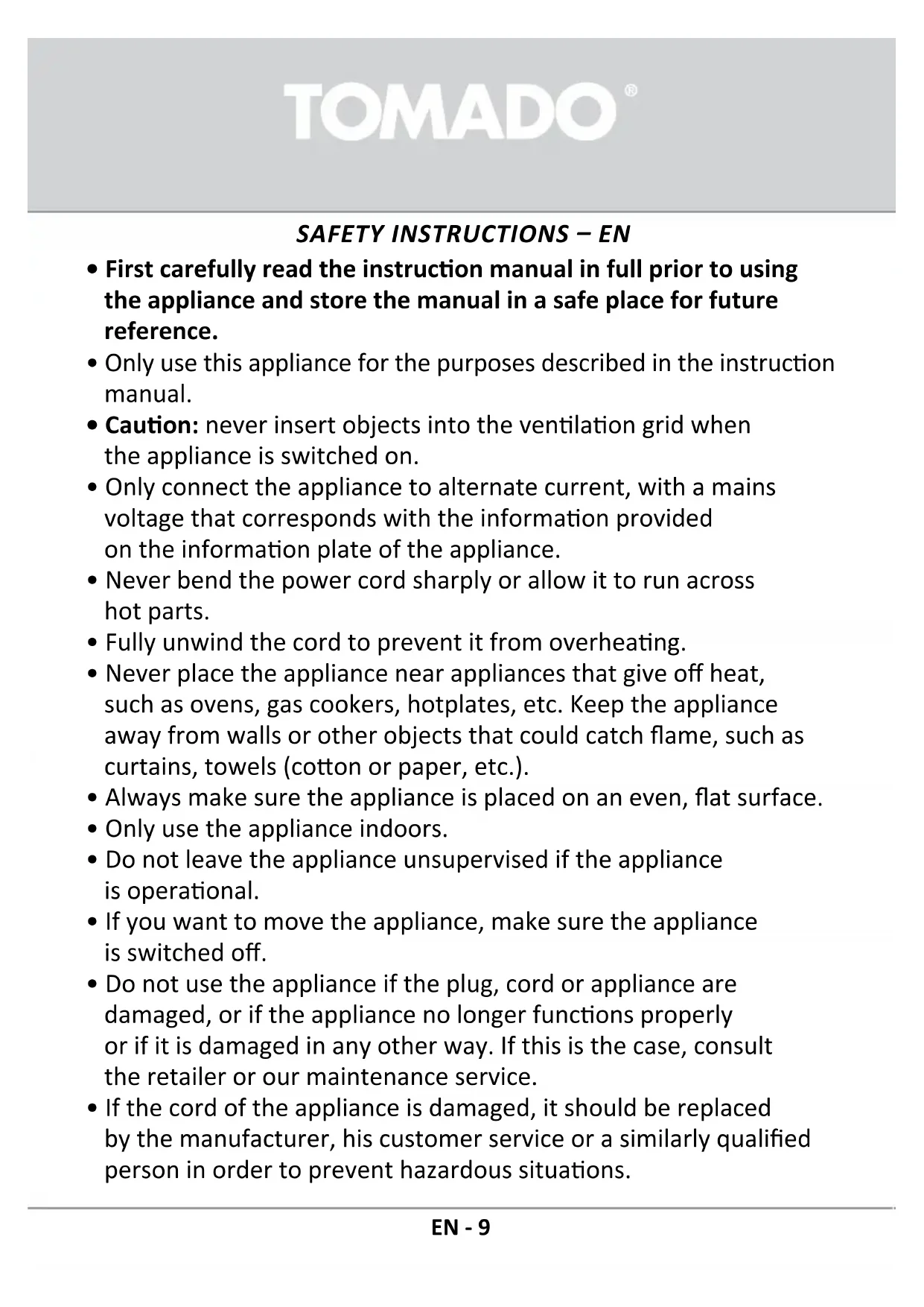 Download the instructions for your Fan in PDF format for free! Find your manual TFC7503B - Tomado and take your electronic device back in hand. On this page are published all the documents necessary for the use of your device. TFC7503B by Tomado.