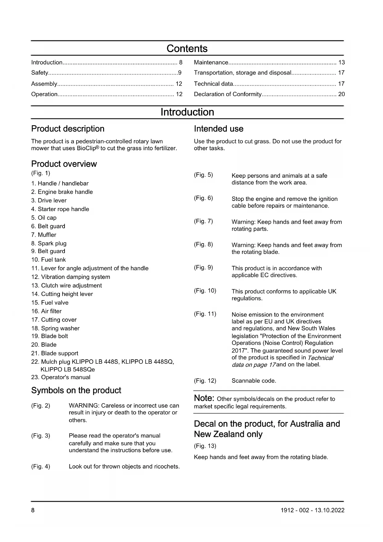 the rotating blade. (Fig. 9) This product is in accordance with applicable EC directives. (Fig. 10) This product conforms to applicable UK regulations. (Fig. 11) Noise emission to the environment label as per EU and UK directives and regulations, and New South Wales legislation "Protection of the Environment Operations (Noise Control) Regulation 2017". The guaranteed sound power level of the product is specified in Technical data on page 17 and on the label. (Fig. 12) Scannable code. Note: Other symbols/decals on the product refer to market specific legal requirements. Decal on the product, for Australia and New Zealand only (Fig. 13) Keep hands and feet away from the rotating blade.