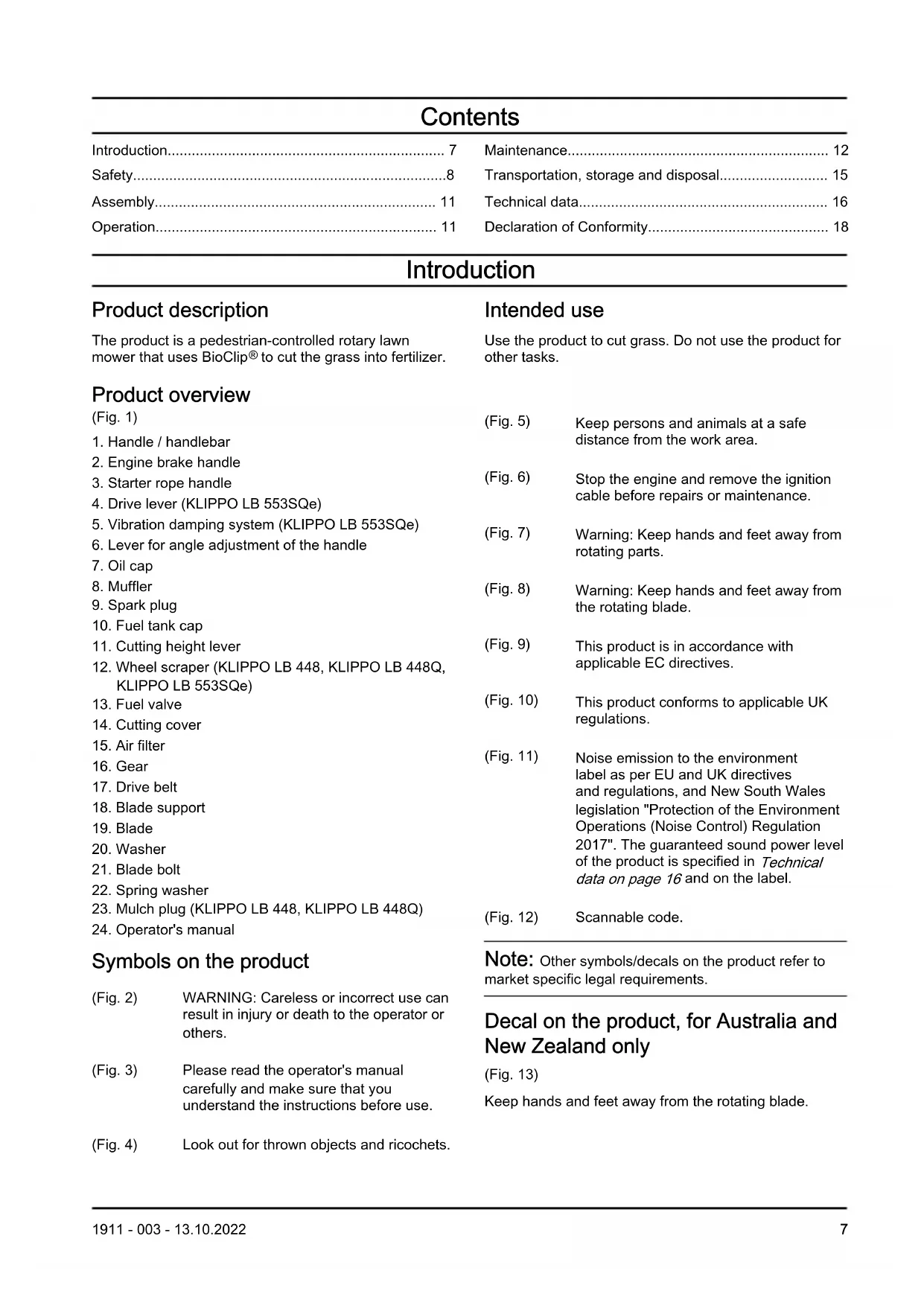 the rotating blade. (Fig. 9) This product is in accordance with applicable EC directives. (Fig. 10) This product conforms to applicable UK regulations. (Fig. 11) Noise emission to the environment label as per EU and UK directives and regulations, and New South Wales legislation "Protection of the Environment Operations (Noise Control) Regulation 2017". The guaranteed sound power level of the product is specified in Technical data on page 16 and on the label. (Fig. 12) Scannable code. Note: Other symbols/decals on the product refer to market specific legal requirements. Decal on the product, for Australia and New Zealand only (Fig. 13) Keep hands and feet away from the rotating blade. 1911 - 003 - 13.10.2022 7Euro V Emissions