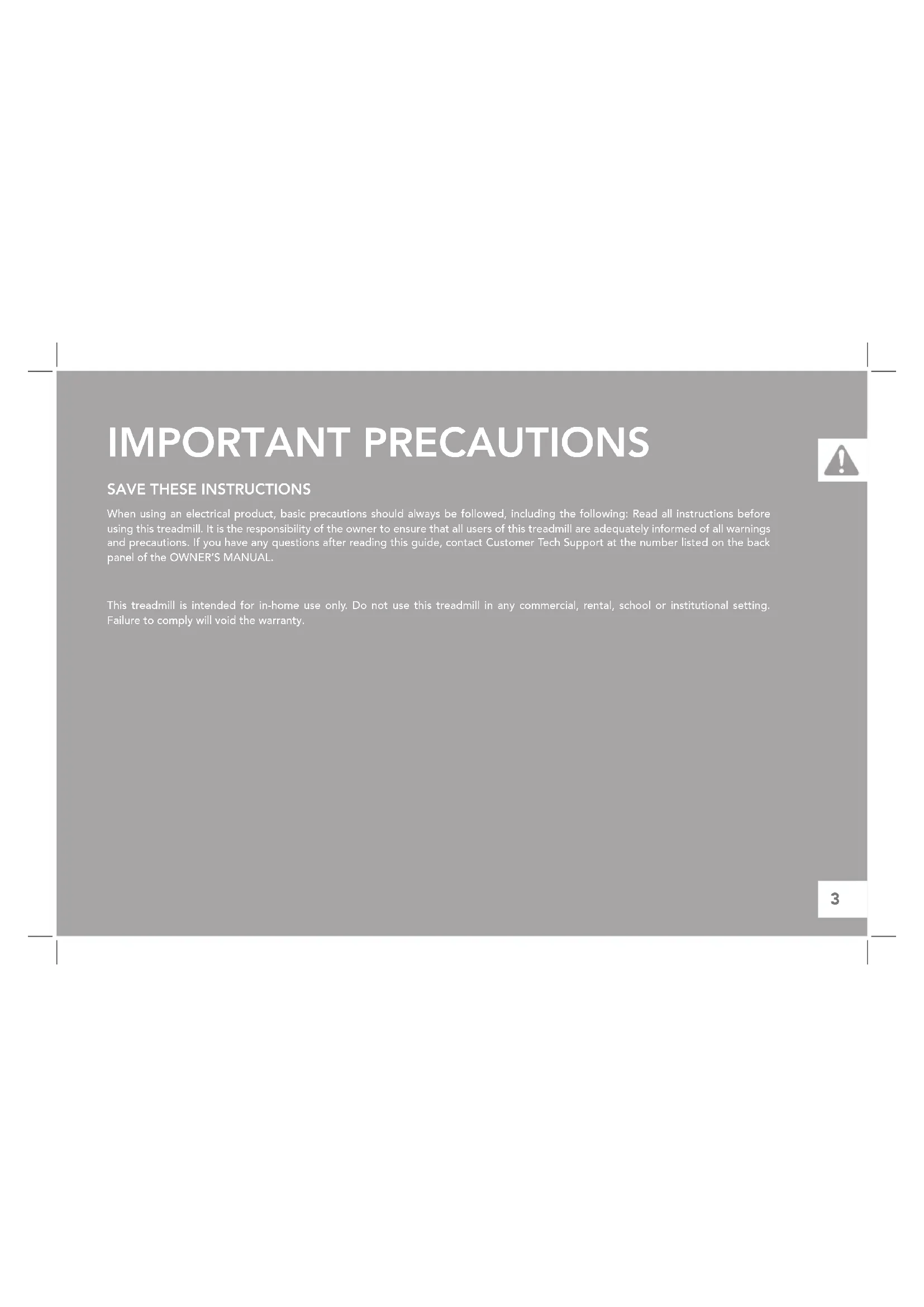 When using an electrical product, basic precautions should always be followed, including the following: Read all instructions before using this treadmill. It is the responsibility of the owner to ensure that all users of this treadmill are adequately informed of all warnings and precautions. If you have any questions after reading this guide, contact Customer Tech Support at the number listed on the back panel of the OWNER’S MANUAL. This treadmill is intended for in-home use only. Do not use this treadmill in any commercial, rental, school or institutional setting. Failureto comply will void the warranty.4 TO REDUCE THE RISK OF BURNS, FIRE, ELECTRICAL SHOCK OR INJURY TO PERSONS: