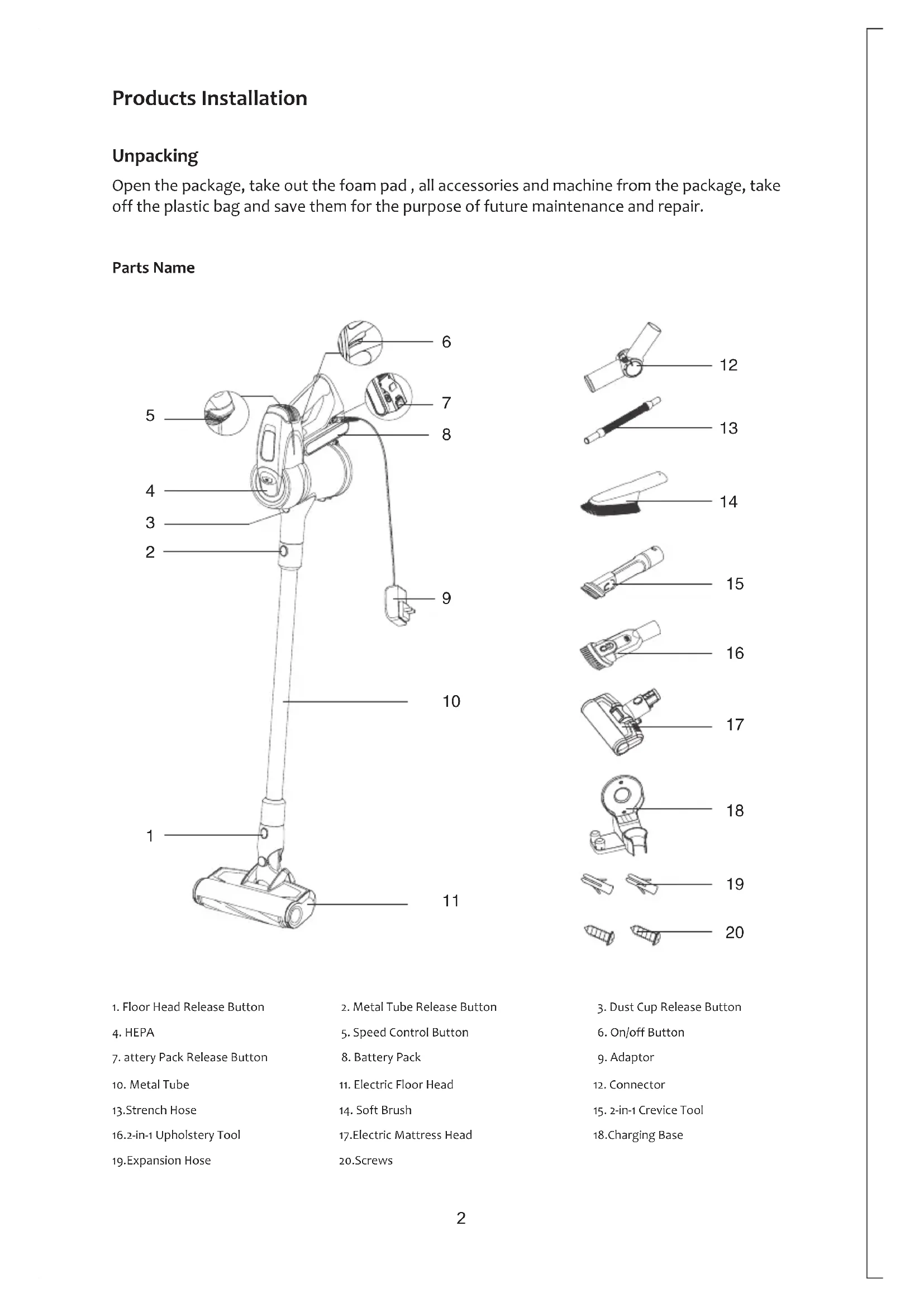 Products Installation Unpacking Parts Name Open the package, take out the foam pad , all accessories and machine from the package, take off the plastic bag and save them for the purpose of future maintenance and repair.