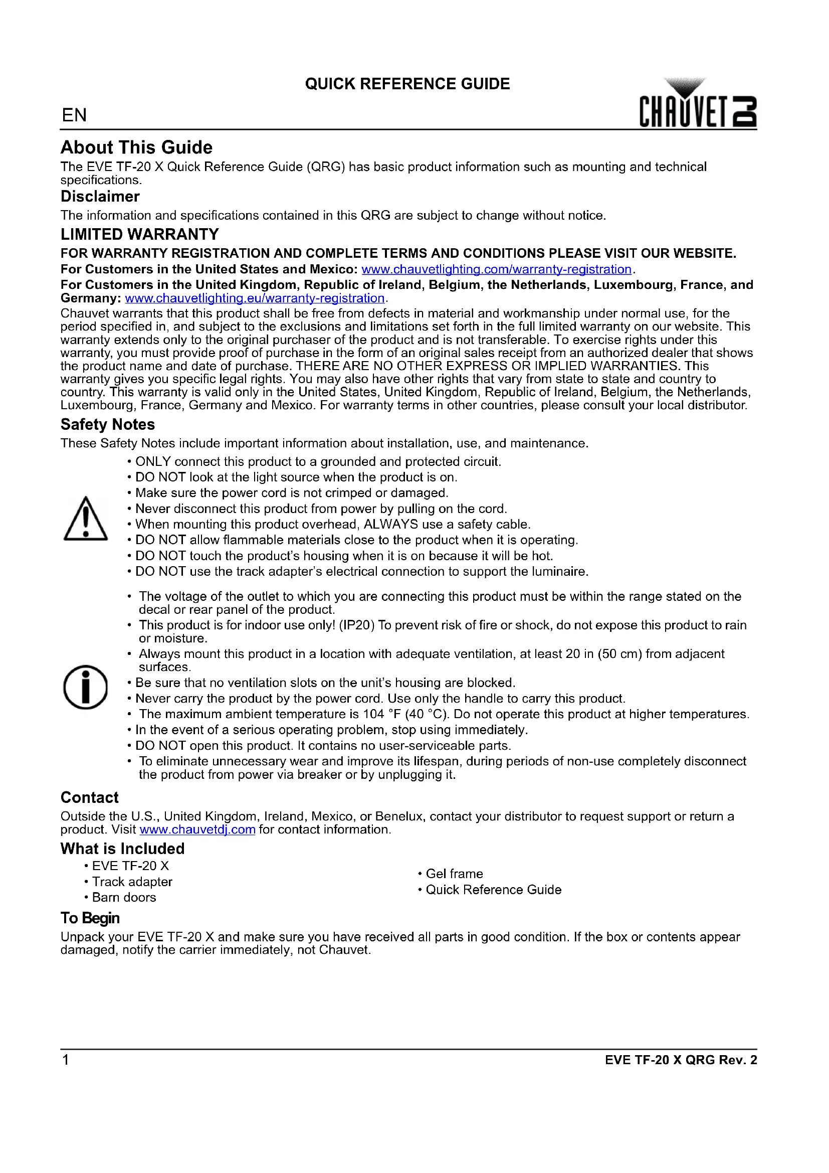 EVE TF-20 X QRG Rev. 2 About This Guide The EVE TF-20 X Quick Reference Guide (QRG) has basic product information such as mounting and technical specifications. Disclaimer The information and specifications contained in this QRG are subject to change without notice. LIMITED WARRANTY FOR WARRANTY REGISTRATION AND COMPLETE TERMS AND CONDITIONS PLEASE VISIT OUR WEBSITE. For Customers in the United States and Mexico: www.chauvetlighting.com/warranty-registration