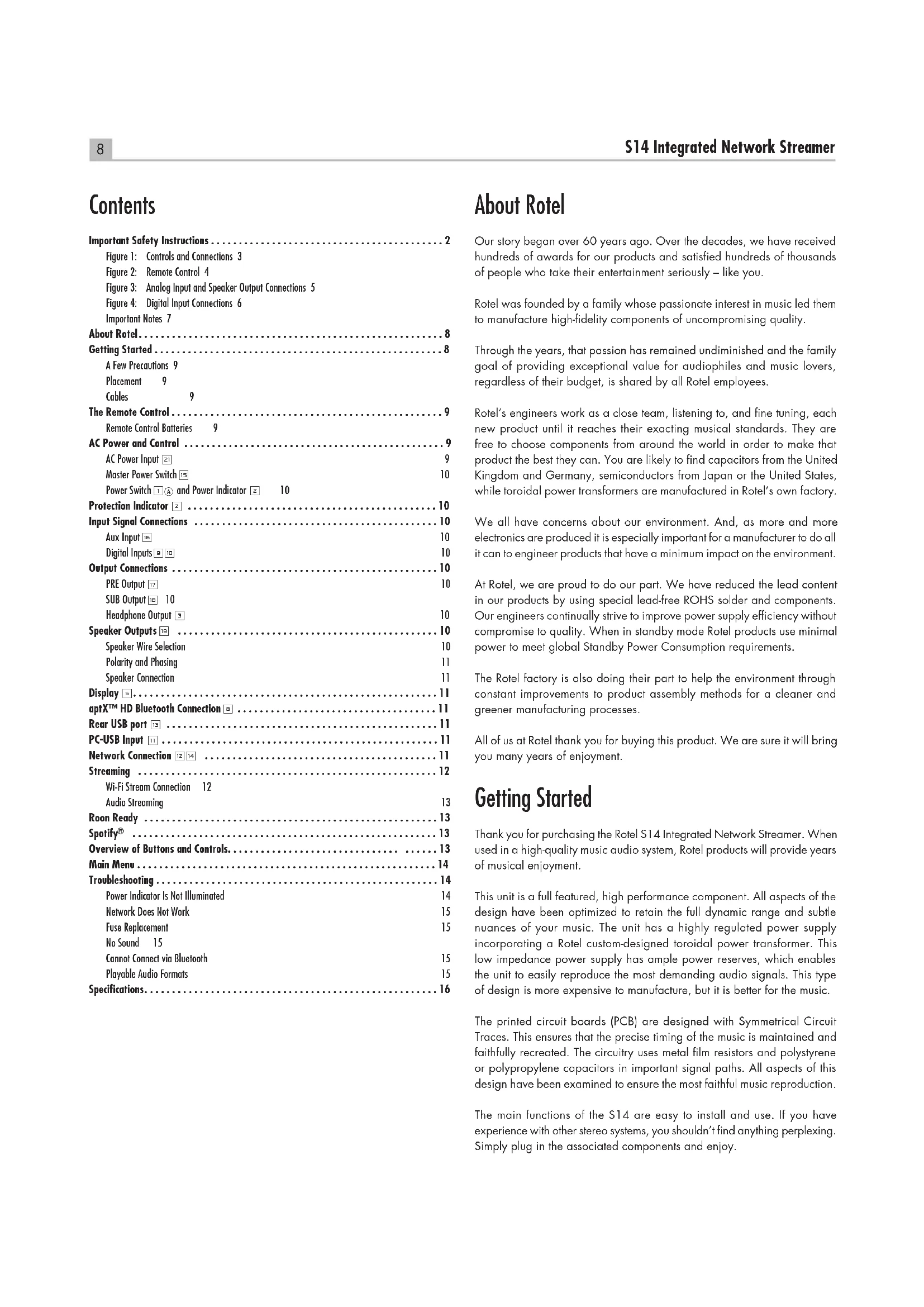 the unit to moisture or water. Do not expose the unit to dripping or splashing. Do not place objects filled with liquids, such as vases, on the unit. Do not allow foreign objects to get into the enclosure. If the unit is exposed to moisture, or a foreign object gets into the enclosure, immediately disconnect the power cord from the wall. Take the unit to a qualified service person for inspection and necessary repairs. Read these instructions. Keep these instructions. Heed all warnings. Follow all instructions. Do not use this apparatus near water. Clean only with dry cloth. Do not block any ventilation openings. Install in accordance with the manufacturer’s instructions. Do not install near any heat sources such as radiators, heat registers, stoves, or other apparatus (including amplifiers) that produce heat. Do not defeat the safety purpose of the polarized or grounding-type plug. A polarized plug has two blades with one wider than the other. A grounding type plug has two blades and a third grounding prong. The wide blade or the third prong are provided for your safety. If the provided plug does not fit into your outlet, consult an electrician for replacement of the obsolete outlet. Protect the power cord from being walked on or pinched particularly at plugs, convenience receptacles, and the point where they exit from the apparatus. Only use attachments/accessories specified by the manufacturer. Use only with the cart, stand, tripod, bracket, or table specified by the manufacturer, or sold with the apparatus. When a cart is used, use with caution when moving the cart/apparatus combination to avoid injury from tip-over. Unplug this apparatus during lightning storms or when unused for long periods of time. Refer all servicing to qualified service personnel. Servicing is required when the apparatus has been damaged in any way, such as power- supply cord or plug is damaged, liquid has been spilled or objects have fallen into the apparatus, the apparatus has been exposed to rain or moisture, does not operate normally, or has been dropped. The apparatus should be used in non tropical climate. The ventilation should not be impeded by covering the ventilation openings with items, such as newspapers, table-cloths, curtains, etc. No naked flame sources, such as lighted candles, should be placed on the apparatus. Touching uninsulated terminals or wiring may result in an unpleasant sensation. Rotel products are designed to comply with international directives on the Restriction of Hazardous Substances (RoHS) in electrical and electronic equipment and the disposal of Waste Electrical and Electronic Equipment (WEEE). The crossed wheelie bin symbol indicates compliance and that the products must be appropriately recycled or processed in accordance with these directives. Important Safety Instructions This symbol means that this unit is double insulated. An earth connection is not required.3 Figure 1: Controls and Connections Commandes et Branchements Bedienelemente und Anschlüsse Controles y Conexiones Controlli e connessioni De bedieningsorganen en aansluitingen Kontroller och anslutningar Органы управления и разъемы 100-120V/220-240V~50/60HzMODEL: S14PRODUCT NAME: INTEGRATED NETWORK STREAMERPOWER CONSUMPTION: 280WMADE IN CHINA OFF