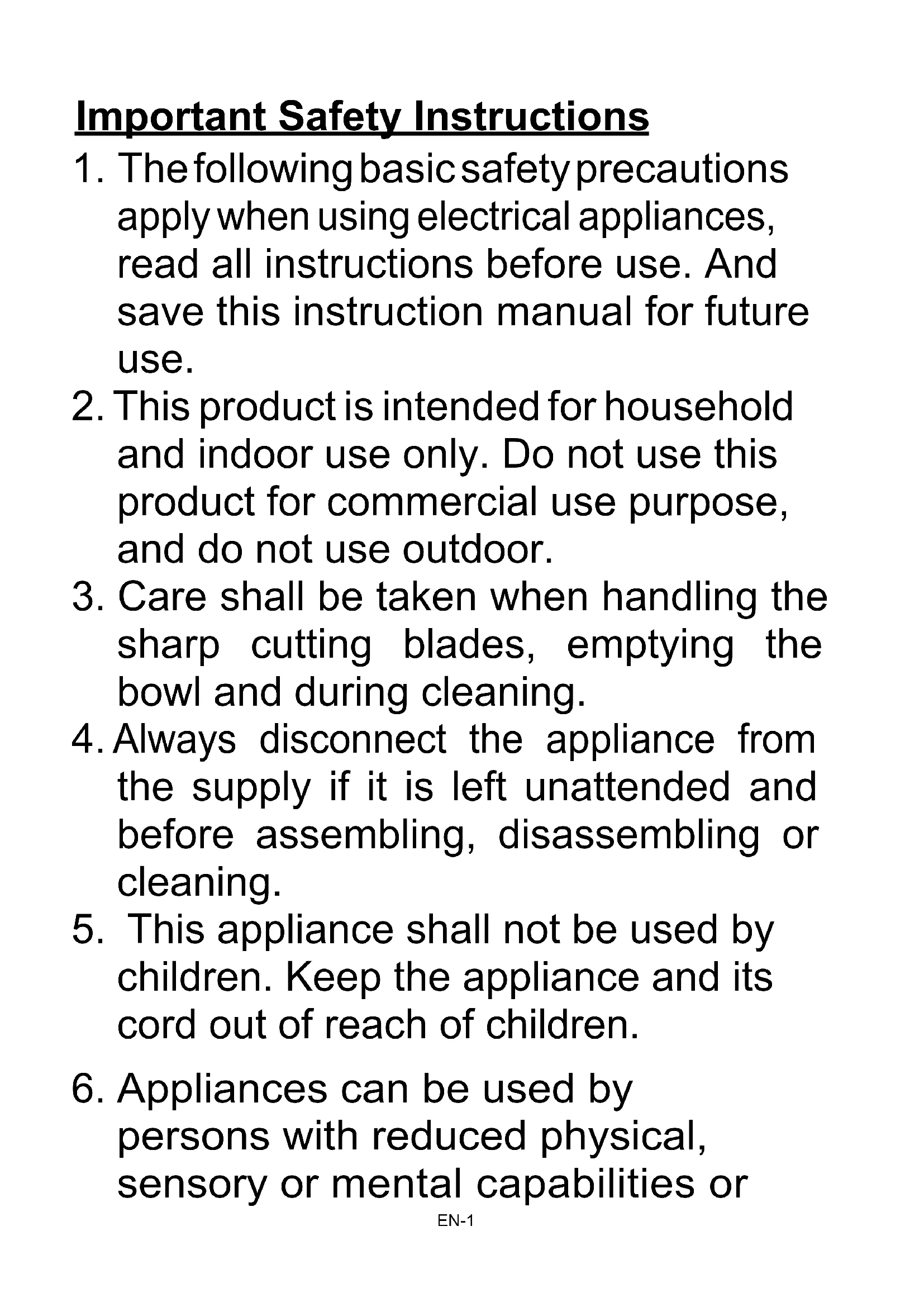 disconnect from supply if it is left unattended and before assembling, disassembling, cleaning or approaching parts that move in use.EN-4