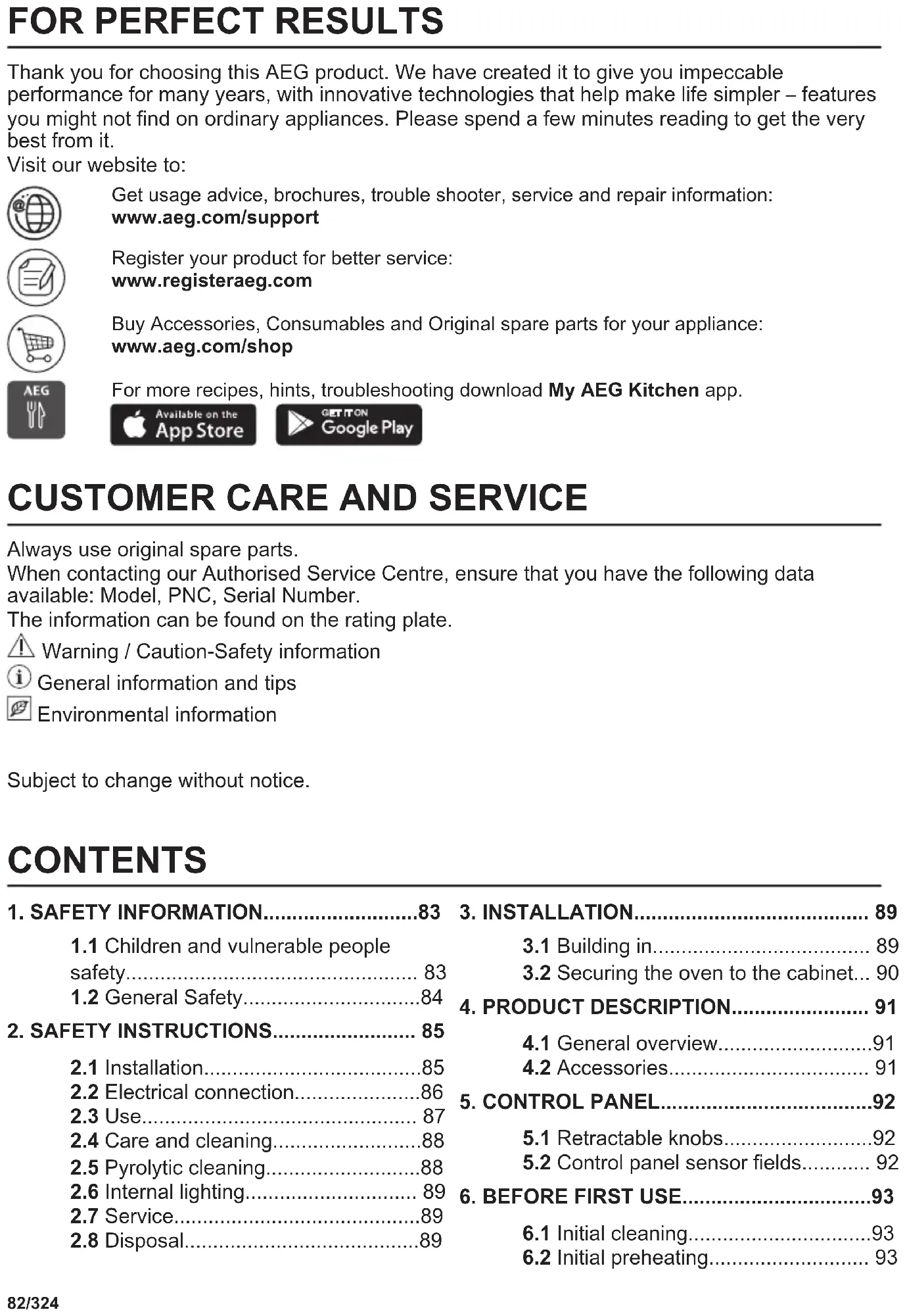Always use original spare parts. When contacting our Authorised Service Centre, ensure that you have the following data available: Model, PNC, Serial Number. The information can be found on the rating plate. Warning / Caution-Safety information General information and tips Environmental information Subject to change without notice. CONTENTS
