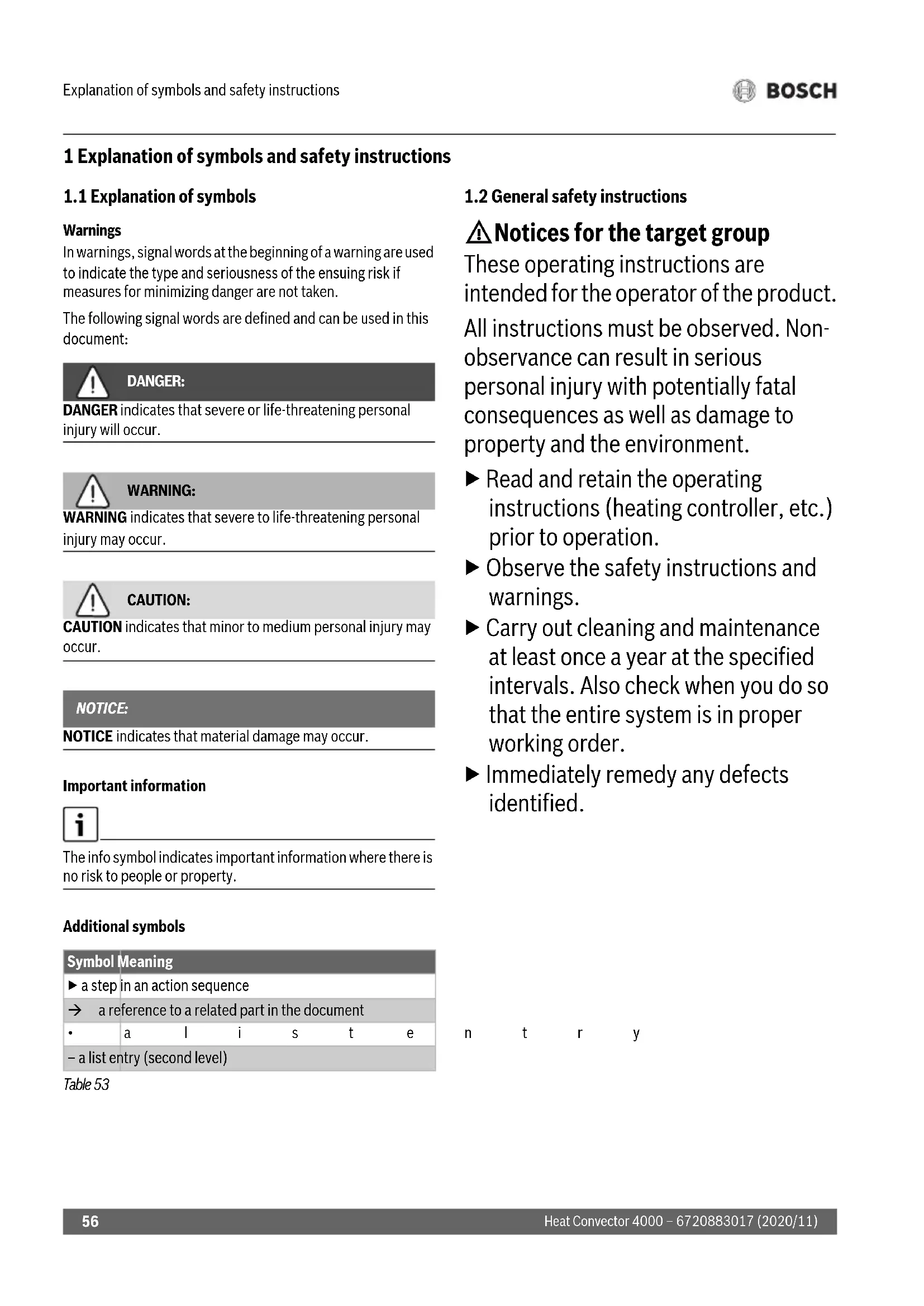 WARNING indicates that severe to life-threatening personal injury may occur. CAUTION: CAUTION indicates that minor to medium personal injury may occur. NOTICE: NOTICE indicates that material damage may occur. Important information The info symbol indicates important information where there is no risk to people or property. Additional symbols Table 53