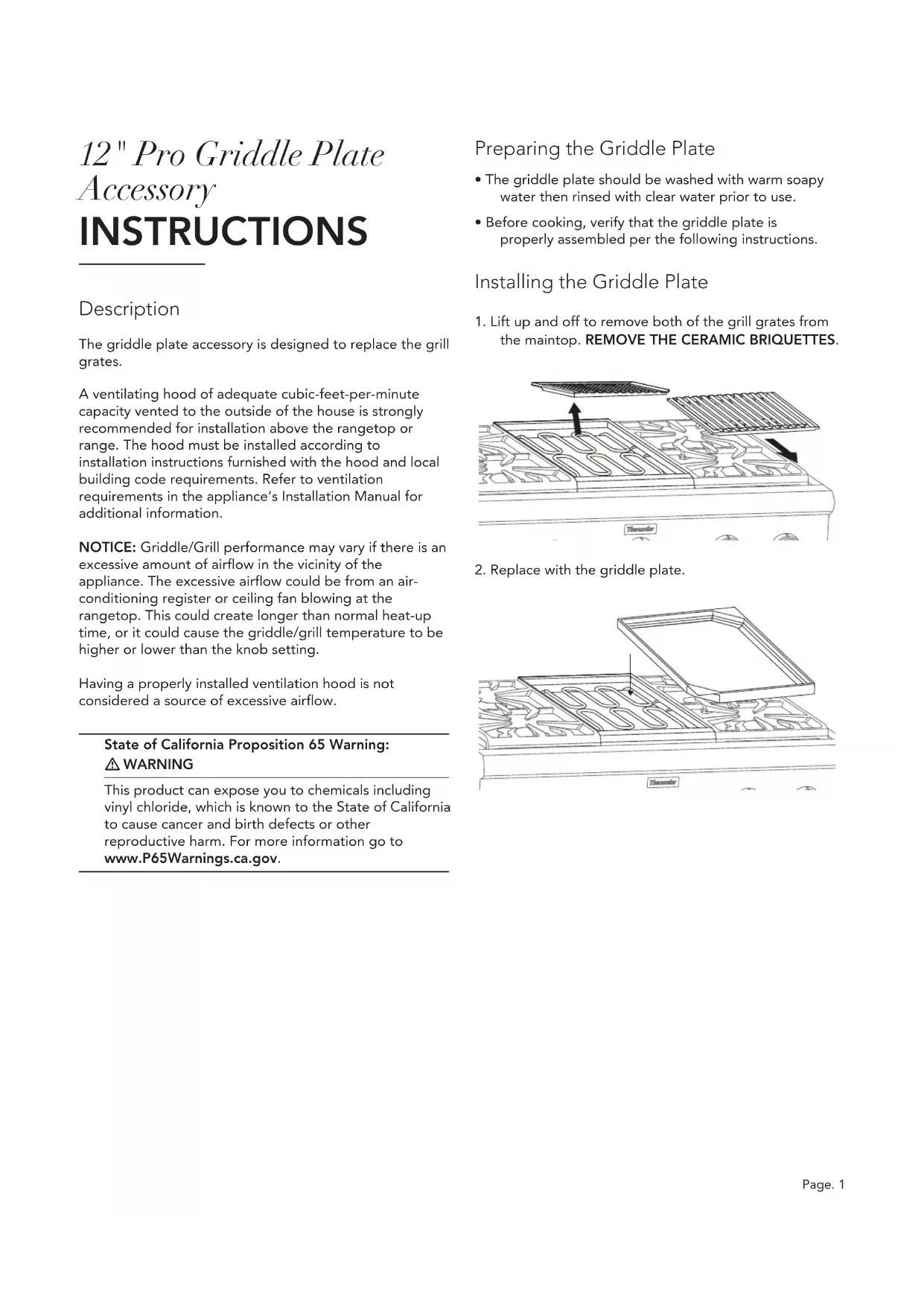 Page. 1 12" Pro Griddle Plate Accessory INSTRUCTIONS Description The griddle plate accessory is designed to replace the grill grates. A ventilating hood of adequate cubic-feet-per-minute capacity vented to the outside of the house is strongly recommended for installation above the rangetop or range. The hood must be installed according to installation instructions furnished with the hood and local building code requirements. Refer to ventilation requirements in the appliance’s Installation Manual for additional information. NOTICE: Griddle/Grill performance may vary if there is an excessive amount of airflow in the vicinity of the appliance. The excessive airflow could be from an air- conditioning register or ceiling fan blowing at the rangetop. This could create longer than normal heat-up time, or it could cause the griddle/grill temperature to be higher or lower than the knob setting. Having a properly installed ventilation hood is not considered a source of excessive airflow. State of California Proposition 65 Warning: WARNING This product can expose you to chemicals including vinyl chloride, which is known to the State of California to cause cancer and birth defects or other reproductive harm. For more information go to www.P65Warnings.ca.gov. Preparing the Griddle Plate