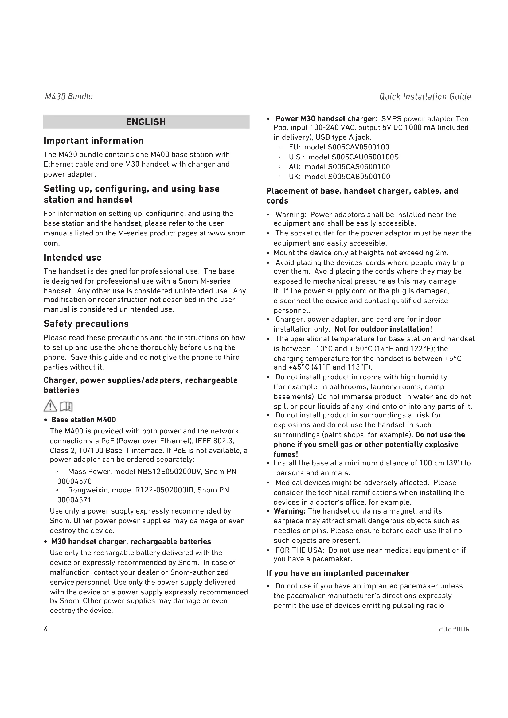 M430 Bundle Quick Installation Guide ENGLISH Important information The M430 bundle contains one M400 base station with Ethernet cable and one M30 handset with charger and power adapter. Setting up, configuring, and using base station and handset For information on setting up, conguring, and using the base station and the handset, please refer to the user manuals listed on the M-series product pages at www.snom. com. Intended use The handset is designed for professional use. The base is designed for professional use with a Snom M-series handset. Any other use is considered unintended use. Any modication or reconstruction not described in the user manual is considered unintended use. Safety precautions Please read these precautions and the instructions on how to set up and use the phone thoroughly before using the phone. Save this guide and do not give the phone to third parties without it. Charger, power supplies/adapters, rechargeable batteries