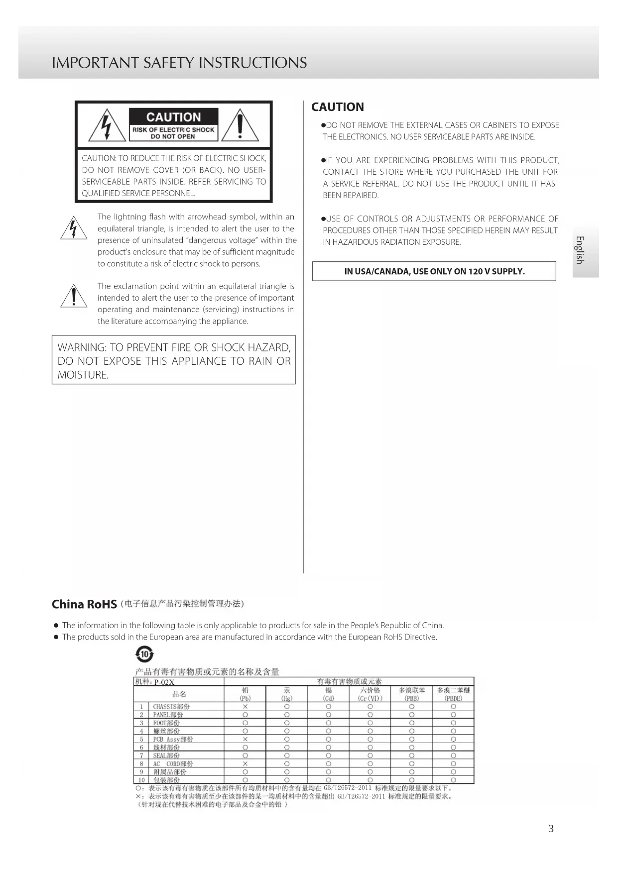 DO NOT EXPOSE THIS APPLIANCE TO RAIN OR MOISTURE. CAUTION o DO NOT REMOVE THE EXTERNAL CASES OR CABINETS TO EXPOSE THE ELECTRONICS. NO USER SERVICEABLE PARTS ARE INSIDE. o IF YOU ARE EXPERIENCING PROBLEMS WITH THIS PRODUCT, CONTACT THE STORE WHERE YOU PURCHASED THE UNIT FOR A SERVICE REFERRAL. DO NOT USE THE PRODUCT UNTIL IT HAS BEEN REPAIRED. o USE OF CONTROLS OR ADJUSTMENTS OR PERFORMANCE OF PROCEDURES OTHER THAN THOSE SPECIFIED HEREIN MAY RESULT IN HAZARDOUS RADIATION EXPOSURE.IN USA/CANADA, USE ONLY ON 120 V SUPPLY. China RoHS o The information in the following table is only applicable to products for sale in the People’s Republic of China. o The products sold in the European area are manufactured in accordance with the European RoHS Directive. *%73;*%74 IMPORTANT SAFETY INSTRUCTIONS (continued) Model for USA This equipment has been tested and found to comply with the lim- its for a Class B digital device, pursuant to Part 15 of the FCC Rules. These limits are designed to provide reasonable protection against harmful interference in a residential installation. This equipment generates, uses, and can radiate radio frequency energy and, if not installed and used in accordance with the instructions, may cause harmful interference to radio communications. However, there is no guarantee that interference will not occur in a particular instal- lation. If this equipment does cause harmful interference to radio or television reception, which can be determined by turning the equipment off and on, the user is encouraged to try to correct the interference by one or more of the following measures: