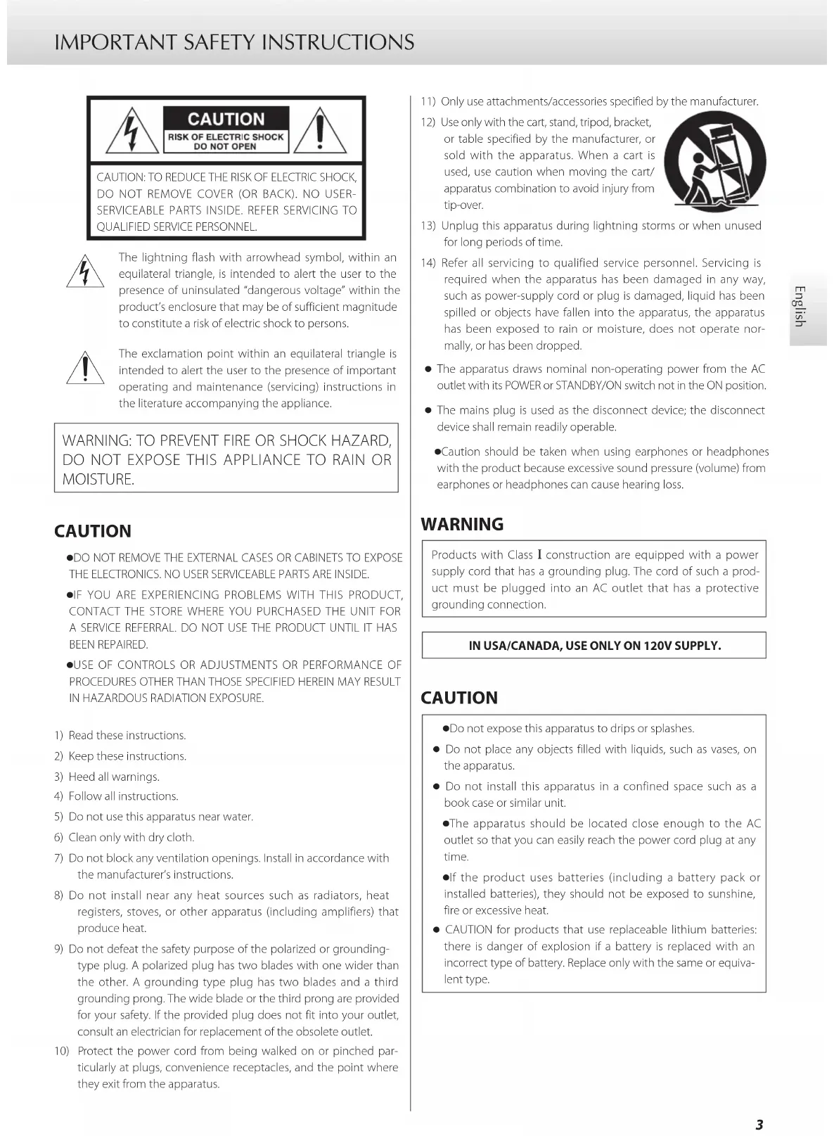 ticularly at plugs, convenience receptacles, and the point where they exit from the apparatus.11) Only use attachments/accessories specified by the manufacturer.12) Use only with the cart, stand, tripod, bracket, or table specified by the manufacturer, or sold with the apparatus. When a cart is used, use caution when moving the cart/apparatus combination to avoid injury from tip-over.13) Unplug this apparatus during lightning storms or when unused for long periods of time.14) Refer all servicing to qualified service personnel. Servicing is required when the apparatus has been damaged in any way, such as power-supply cord or plug is damaged, liquid has been spilled or objects have fallen into the apparatus, the apparatus has been exposed to rain or moisture, does not operate nor-mally, or has been dropped. o The apparatus draws nominal non-operating power from the AC outlet with its POWER or STANDBY/ON switch not in the ON position. o The mains plug is used as the disconnect device; the disconnect device shall remain readily operable. o Caution should be taken when using earphones or headphones with the product because excessive sound pressure (volume) from earphones or headphones can cause hearing loss. WARNING Products with Class ! construction are equipped with a power supply cord that has a grounding plug. The cord of such a prod-uct must be plugged into an AC outlet that has a protective grounding connection.IN USA/CANADA, USE ONLY ON 120V SUPPLY. CAUTION o Do not expose this apparatus to drips or splashes. o Do not place any objects filled with liquids, such as vases, on the apparatus. o Do not install this apparatus in a confined space such as a book case or similar unit. o The apparatus should be located close enough to the AC outlet so that you can easily reach the power cord plug at any time. o If the product uses batteries (including a battery pack or installed batteries), they should not be exposed to sunshine, fire or excessive heat. o CAUTION for products that use replaceable lithium batteries: there is danger of explosion if a battery is replaced with an incorrect type of battery. Replace only with the same or equiva-lent type.4 IMPORTANT SAFETY INSTRUCTIONS (continued)