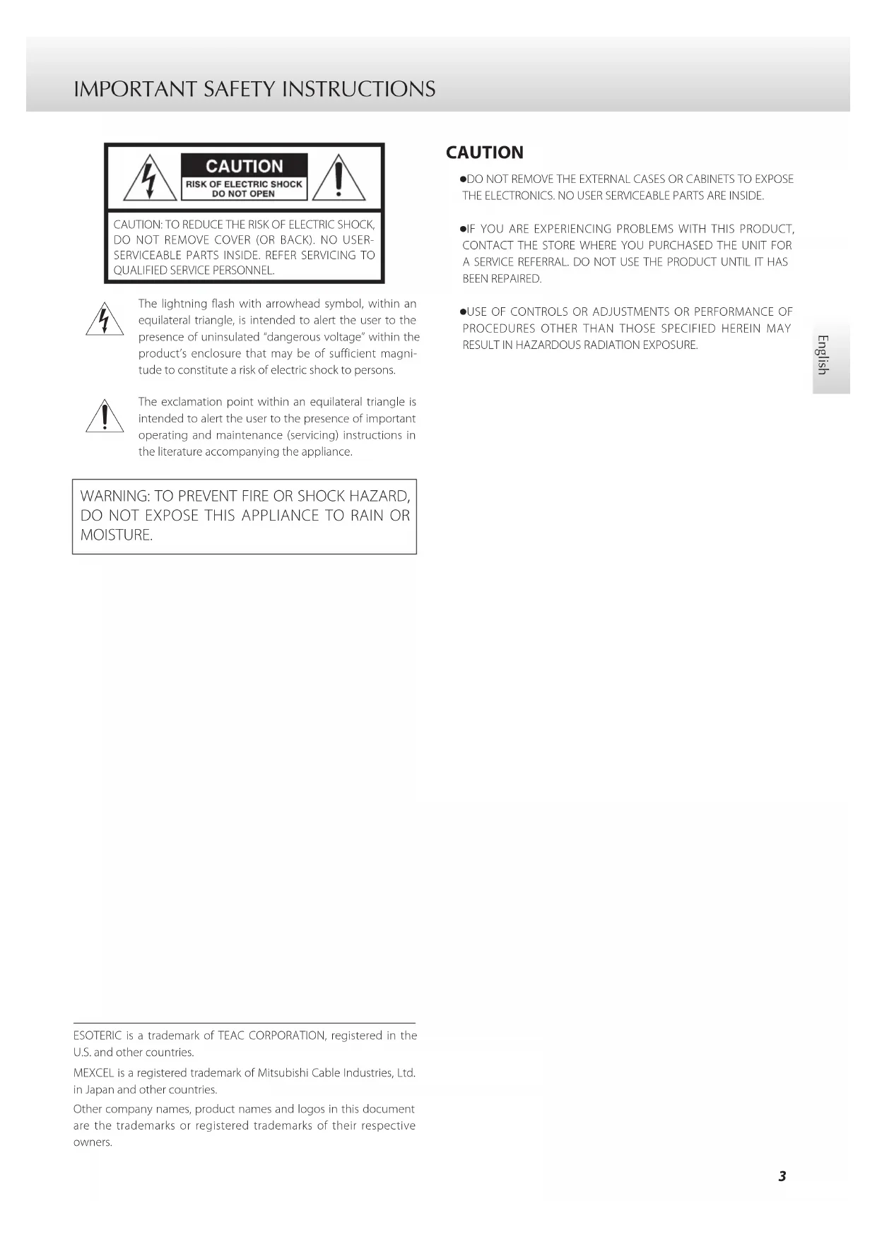 DO NOT EXPOSE THIS APPLIANCE TO RAIN OR MOISTURE. ESOTERIC is a trademark of TEAC CORPORATION, registered in the U.S. and other countries.MEXCEL is a registered trademark of Mitsubishi Cable Industries, Ltd. in Japan and other countries.Other company names, product names and logos in this document are the trademarks or registered trademarks of their respective owners. CAUTION o DO NOT REMOVE THE EXTERNAL CASES OR CABINETS TO EXPOSE THE ELECTRONICS. NO USER SERVICEABLE PARTS ARE INSIDE. o IF YOU ARE EXPERIENCING PROBLEMS WITH THIS PRODUCT, CONTACT THE STORE WHERE YOU PURCHASED THE UNIT FOR A SERVICE REFERRAL. DO NOT USE THE PRODUCT UNTIL IT HAS BEEN REPAIRED. o USE OF CONTROLS OR ADJUSTMENTS OR PERFORMANCE OF PROCEDURES OTHER THAN THOSE SPECIFIED HEREIN MAY RESULT IN HAZARDOUS RADIATION EXPOSURE.4