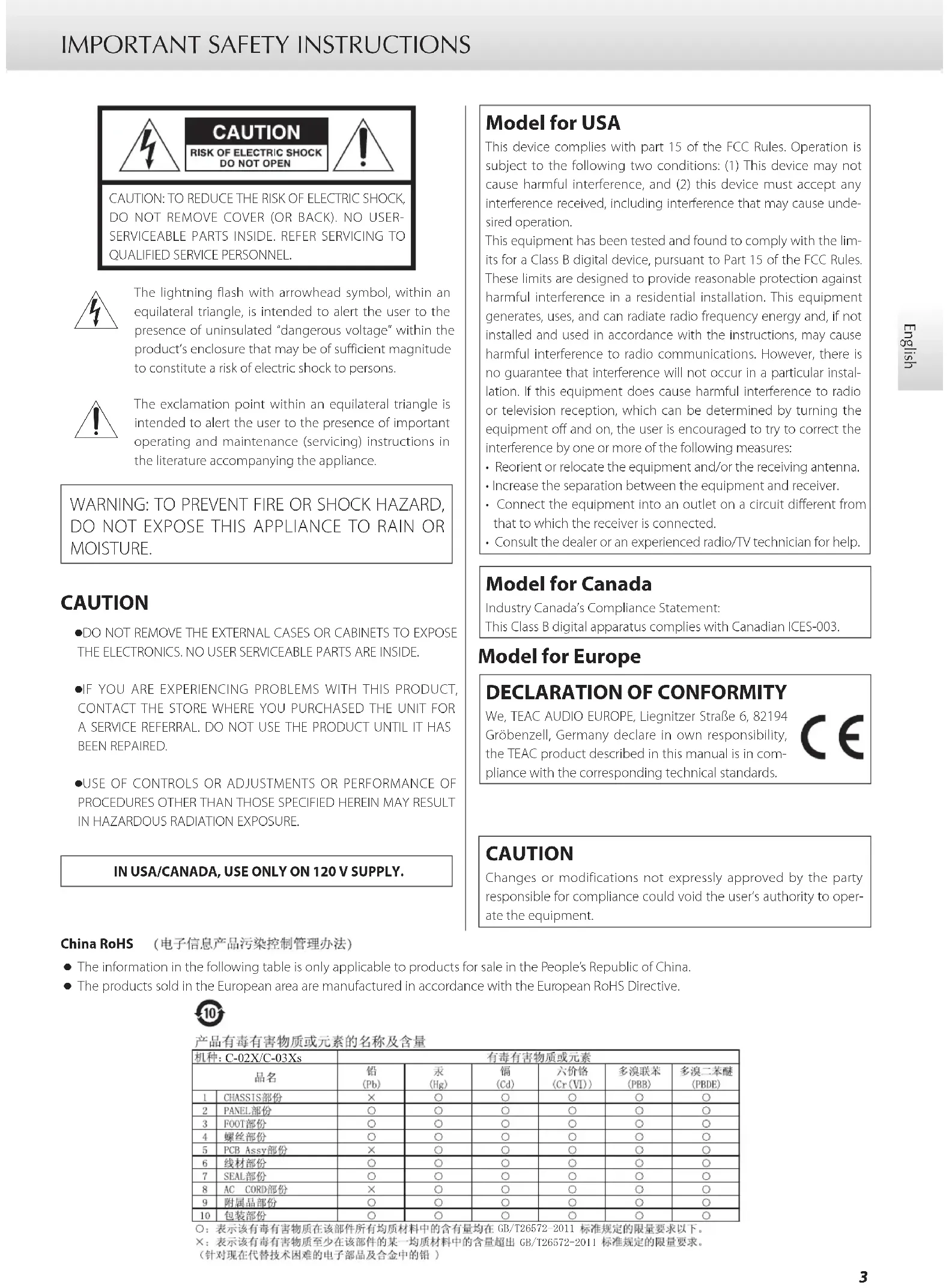 We, TEAC AUDIO EUROPE, Liegnitzer Straße 6, 82194 Gröbenzell, Germany declare in own responsibility, the TEAC product described in this manual is in com-pliance with the corresponding technical standards. CAUTION Changes or modifications not expressly approved by the party responsible for compliance could void the user’s authority to oper-ate the equipment.China RoHS o The information in the following table is only applicable to products for sale in the People’s Republic of China. o The products sold in the European area are manufactured in accordance with the European RoHS Directive. *%7&;&;V*%74 IMPORTANT SAFETY INSTRUCTIONS (continued)