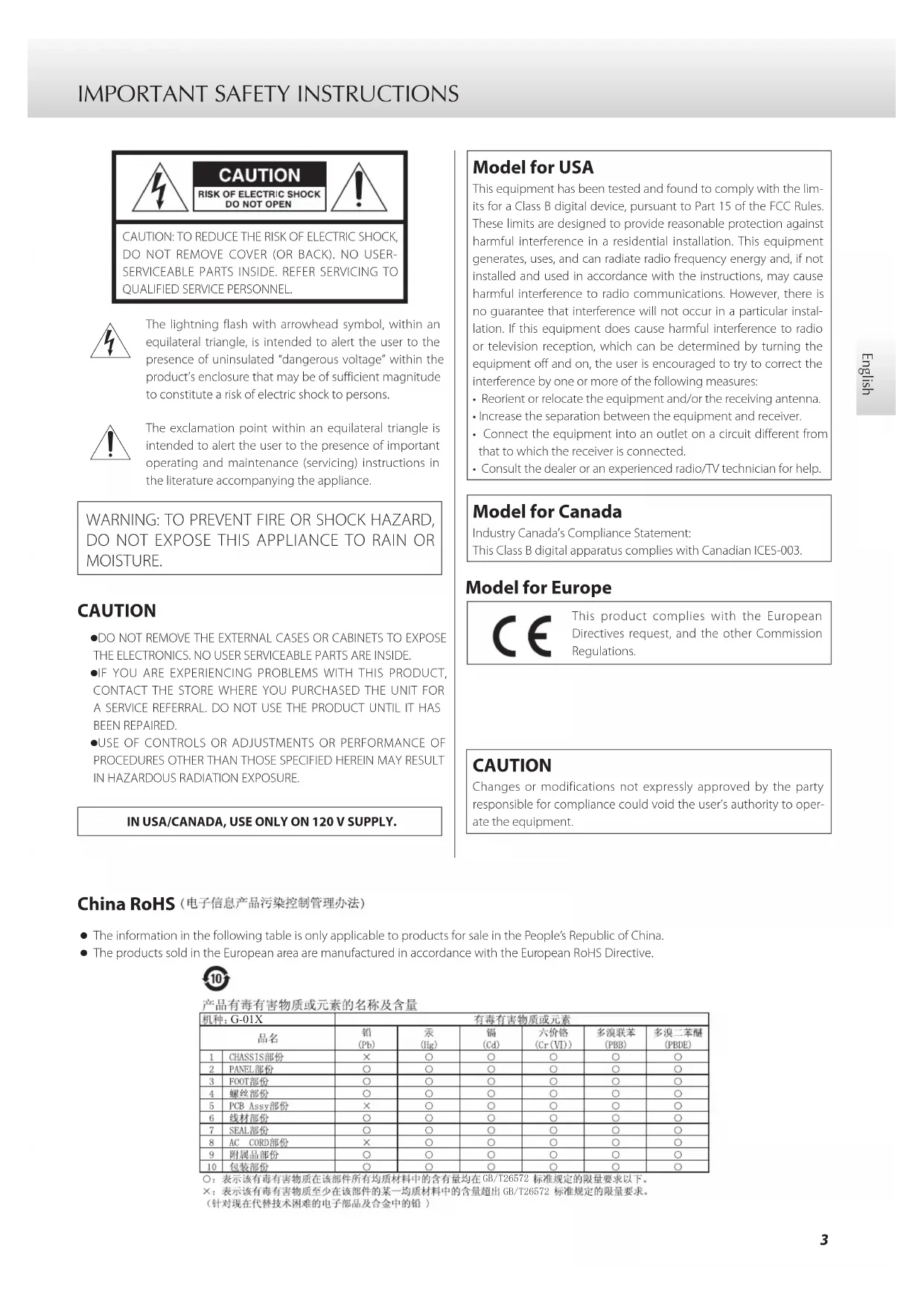 DO NOT EXPOSE THIS APPLIANCE TO RAIN OR MOISTURE. CAUTION o DO NOT REMOVE THE EXTERNAL CASES OR CABINETS TO EXPOSE THE ELECTRONICS. NO USER SERVICEABLE PARTS ARE INSIDE. o IF YOU ARE EXPERIENCING PROBLEMS WITH THIS PRODUCT, CONTACT THE STORE WHERE YOU PURCHASED THE UNIT FOR A SERVICE REFERRAL. DO NOT USE THE PRODUCT UNTIL IT HAS BEEN REPAIRED. o USE OF CONTROLS OR ADJUSTMENTS OR PERFORMANCE OF PROCEDURES OTHER THAN THOSE SPECIFIED HEREIN MAY RESULT IN HAZARDOUS RADIATION EXPOSURE.IN USA/CANADA, USE ONLY ON 120 V SUPPLY. Model for USA This equipment has been tested and found to comply with the lim-its for a Class B digital device, pursuant to Part 15 of the FCC Rules. These limits are designed to provide reasonable protection against harmful interference in a residential installation. This equipment generates, uses, and can radiate radio frequency energy and, if not installed and used in accordance with the instructions, may cause harmful interference to radio communications. However, there is no guarantee that interference will not occur in a particular instal-lation. If this equipment does cause harmful interference to radio or television reception, which can be determined by turning the equipment off and on, the user is encouraged to try to correct the interference by one or more of the following measures:• Reorient or relocate the equipment and/or the receiving antenna.• Increase the separation between the equipment and receiver.• Connect the equipment into an outlet on a circuit different from that to which the receiver is connected.• Consult the dealer or an experienced radio/TV technician for help. Model for Canada Industry Canada’s Compliance Statement:This Class B digital apparatus complies with Canadian ICES-003. Model for Europe This product complies with the European Directives request, and the other Commission Regulations. CAUTION Changes or modifications not expressly approved by the party responsible for compliance could void the user’s authority to oper-ate the equipment. China RoHS o The information in the following table is only applicable to products for sale in the People’s Republic of China. o The products sold in the European area are manufactured in accordance with the European RoHS Directive. *%7*;*%74 IMPORTANT SAFETY INSTRUCTIONS (continued) 1) Read these instructions.2) Keep these instructions.3) Heed all warnings.4) Follow all instructions.5) Do not use this apparatus near water.6) Clean only with dry cloth.7) Do not block any ventilation openings. Install in accordance with the manufacturer's instructions.8) Do not install near any heat sources such as radiators, heat registers, stoves, or other apparatus (including amplifiers) that produce heat.9) Do not defeat the safety purpose of the polarized or grounding-type plug. A polarized plug has two blades with one wider than the other. A grounding type plug has two blades and a third grounding prong. The wide blade or the third prong are pro-vided for your safety. If the provided plug does not fit into your outlet, consult an electrician for replacement of the obsolete outlet.