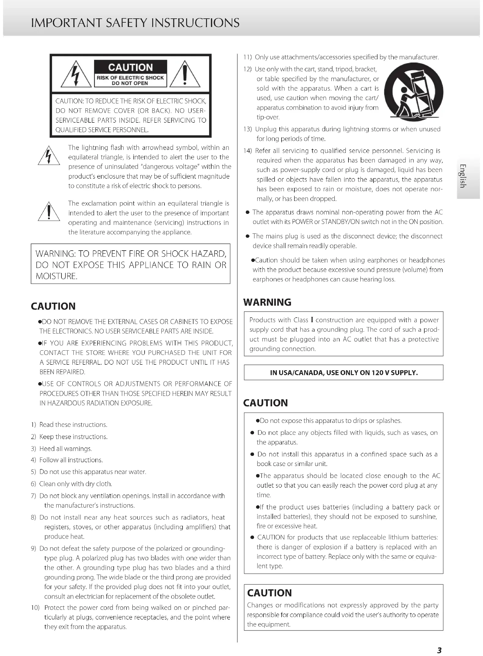 ticularly at plugs, convenience receptacles, and the point where they exit from the apparatus.11) Only use attachments/accessories specified by the manufacturer.12) Use only with the cart, stand, tripod, bracket, or table specified by the manufacturer, or sold with the apparatus. When a cart is used, use caution when moving the cart/apparatus combination to avoid injury from tip-over.13) Unplug this apparatus during lightning storms or when unused for long periods of time.14) Refer all servicing to qualified service personnel. Servicing is required when the apparatus has been damaged in any way, such as power-supply cord or plug is damaged, liquid has been spilled or objects have fallen into the apparatus, the apparatus has been exposed to rain or moisture, does not operate nor-mally, or has been dropped. o The apparatus draws nominal non-operating power from the AC outlet with its POWER or STANDBY/ON switch not in the ON position. o The mains plug is used as the disconnect device; the disconnect device shall remain readily operable. o Caution should be taken when using earphones or headphones with the product because excessive sound pressure (volume) from earphones or headphones can cause hearing loss. WARNING Products with Class ! construction are equipped with a power supply cord that has a grounding plug. The cord of such a prod-uct must be plugged into an AC outlet that has a protective grounding connection.IN USA/CANADA, USE ONLY ON 120 V SUPPLY. CAUTION o Do not expose this apparatus to drips or splashes. o Do not place any objects filled with liquids, such as vases, on the apparatus. o Do not install this apparatus in a confined space such as a book case or similar unit. o The apparatus should be located close enough to the AC outlet so that you can easily reach the power cord plug at any time. o If the product uses batteries (including a battery pack or installed batteries), they should not be exposed to sunshine, fire or excessive heat. o CAUTION for products that use replaceable lithium batteries: there is danger of explosion if a battery is replaced with an incorrect type of battery. Replace only with the same or equiva-lent type. CAUTION Changes or modifications not expressly approved by the party responsible for compliance could void the user’s authority to operate the equipment.4 IMPORTANT SAFETY INSTRUCTIONS (continued)