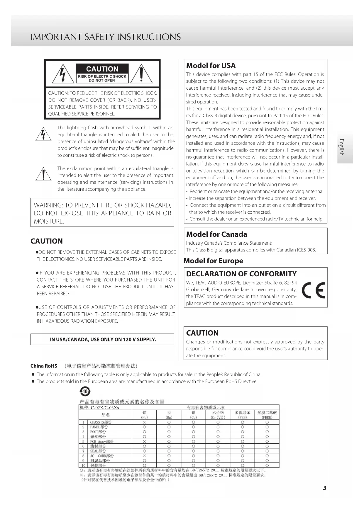 We, TEAC AUDIO EUROPE, Liegnitzer Straße 6, 82194 Gröbenzell, Germany declare in own responsibility, the TEAC product described in this manual is in com-pliance with the corresponding technical standards. CAUTION Changes or modifications not expressly approved by the party responsible for compliance could void the user’s authority to oper-ate the equipment.China RoHS o The information in the following table is only applicable to products for sale in the People’s Republic of China. o The products sold in the European area are manufactured in accordance with the European RoHS Directive. *%7&;&;V*%74 IMPORTANT SAFETY INSTRUCTIONS (continued)