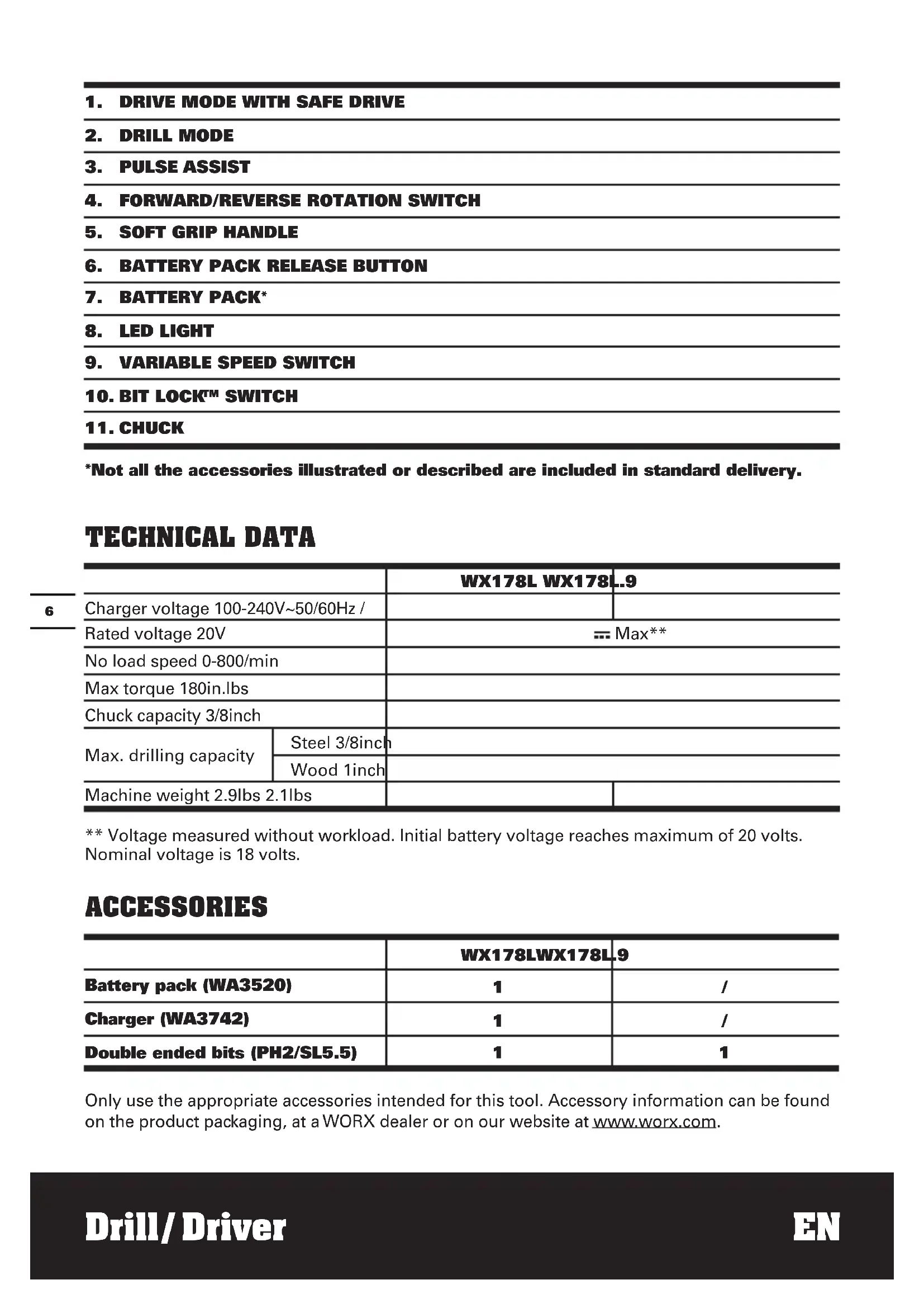 TECHNICAL DATA WX178L WX178L.9 Charger voltage 100-240V~50/60Hz / Rated voltage 20V Max** No load speed 0-800/min Max torque 180in.lbs Chuck capacity 3/8inch Max. drilling capacity Steel 3/8inch Wood 1inch Machine weight 2.9lbs 2.1lbs ** Voltage measured without workload. Initial battery voltage reaches maximum of 20 volts. Nominal voltage is 18 volts. ACCESSORIES WX178L WX178L.9 Battery pack (WA3520) 1 / Charger (WA3742) 1 / Double ended bits (PH2/SL5.5)